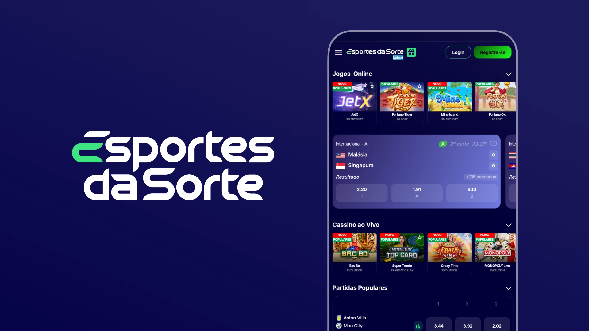 A interface é intuitiva, garantindo fácil navegação entre esportes, mercados e jogos de cassino.