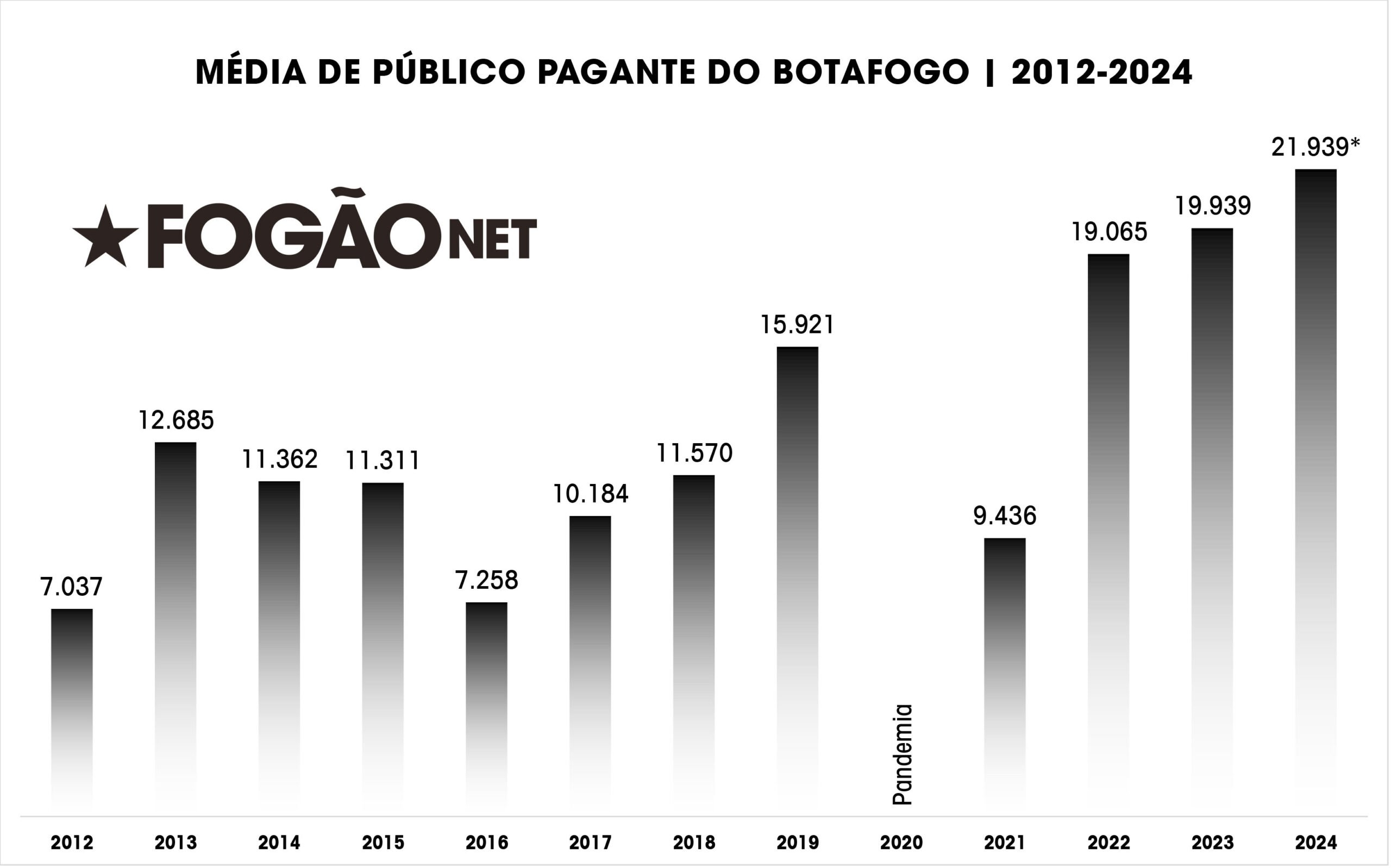 Depois do jogo com o Cuiabá neste sábado (9/11) no Estádio Nilton Santos, o Botafogo já garantiu na temporada 2024 sua melhor média de público pagante desde 2012, quando começou a ser feito o levantamento.