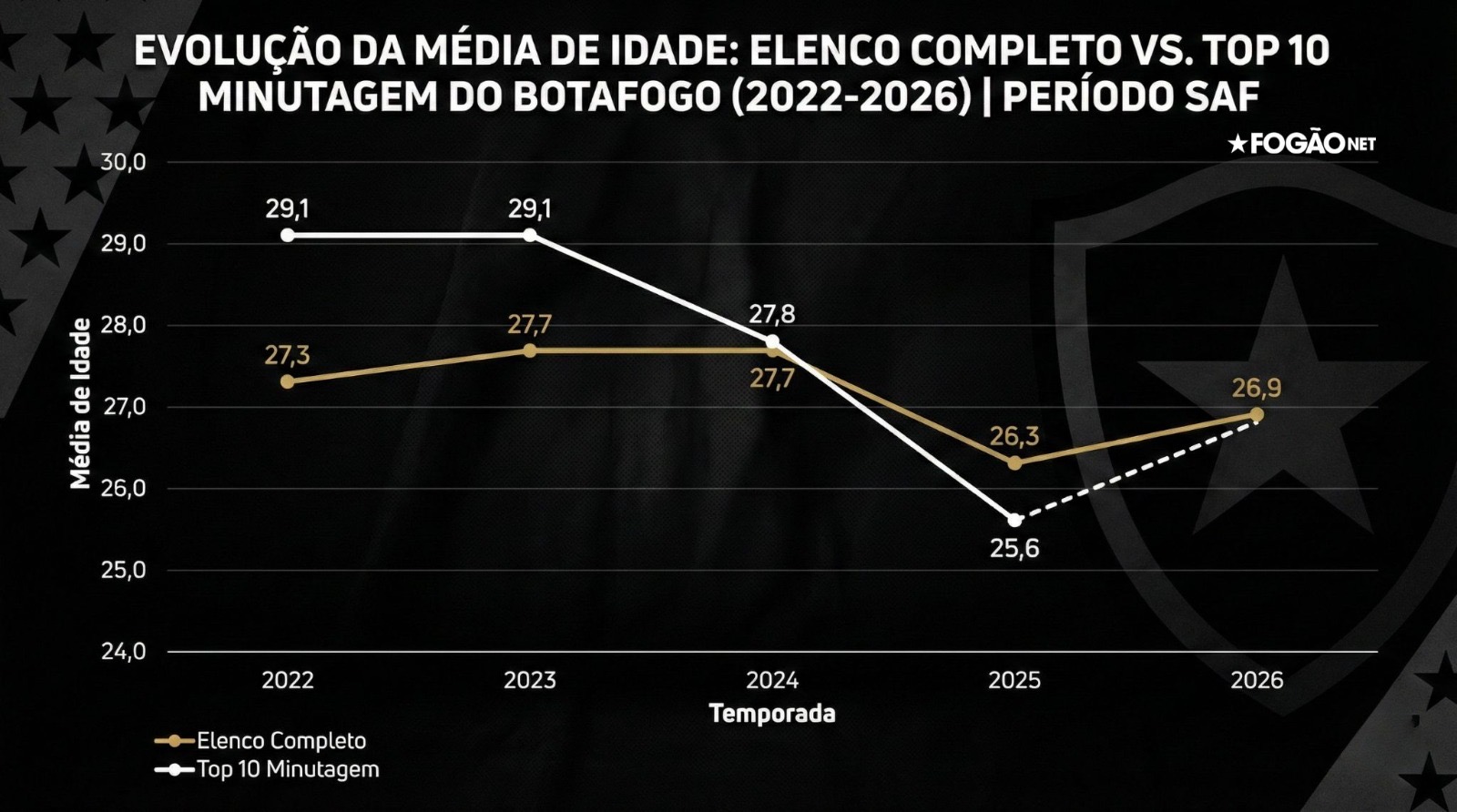 Olhando para o gráfico da evolução da média de idade do elenco, percebemos algo curioso. Em 2022, no início da SAF, nossa média era de 27,3 anos. Hoje, em 2026, ela é de 26,9 anos.