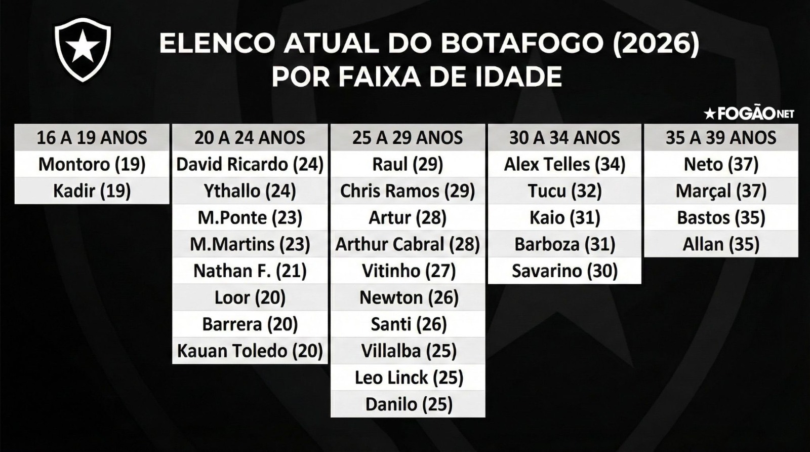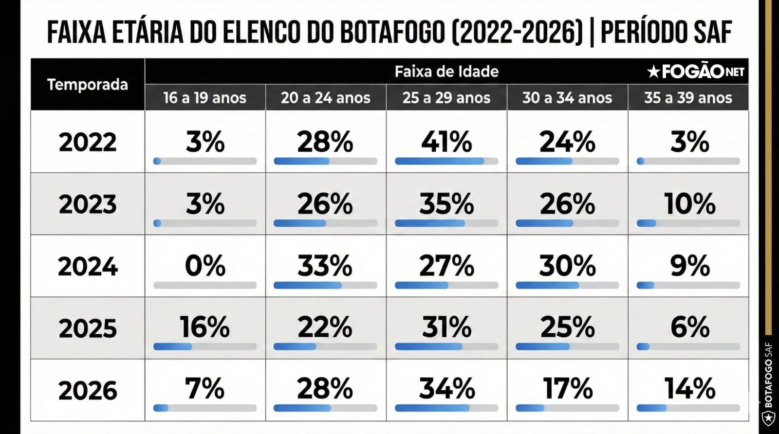 Em 2022 e 2023, o Botafogo tinha forte presença de jogadores entre 25 e 34 anos. Em 2024, essa faixa segue dominante. Em 2025 e 2026, há um aumento claro de atletas mais jovens, mas sempre convivendo com jogadores experientes.