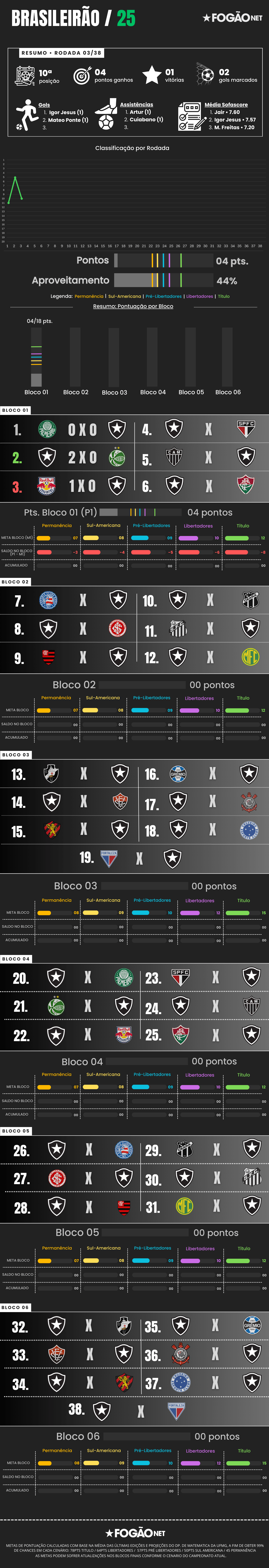 A projeção por blocos divide o campeonato em seis fases, permitindo acompanhar metas de curto e médio prazo. Cada um desses blocos tem uma meta de pontos pré-definida, baseada em dados históricos da competição. As metas variam desde a pontuação necessária para evitar o rebaixamento até o desempenho esperado para um time que briga pelo título. Assim, podemos analisar com clareza o rendimento da equipe em cada etapa do torneio.