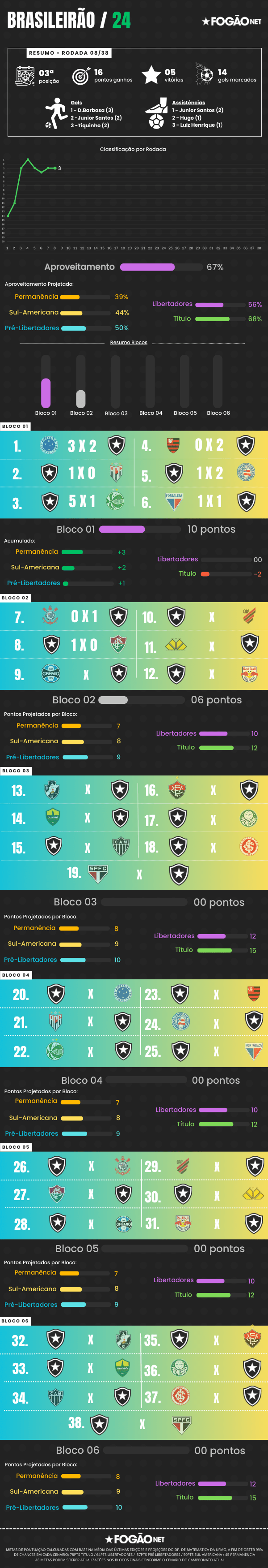 – O aproveitamento de pontos total do Botafogo está em 67%, o que historicamente estaria na margem de times na zona da Libertadores que lutam pelo título.