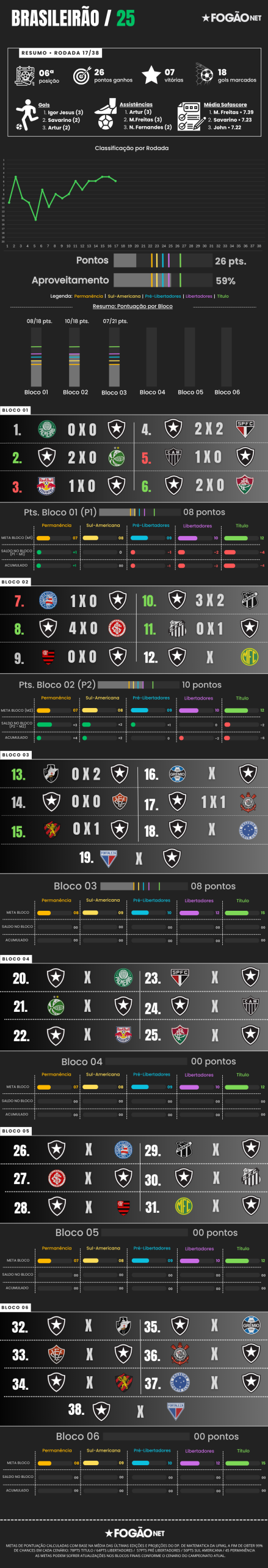 Na análise por blocos, o Botafogo ainda tem dois jogos pendentes: contra o Mirassol (do bloco 2) e contra o Grêmio (do bloco 3), ambos adiados por conta do calendário. Com o aproveitamento atual, o desempenho alvinegro reflete uma campanha de equipe que briga por vaga direta na Libertadores.