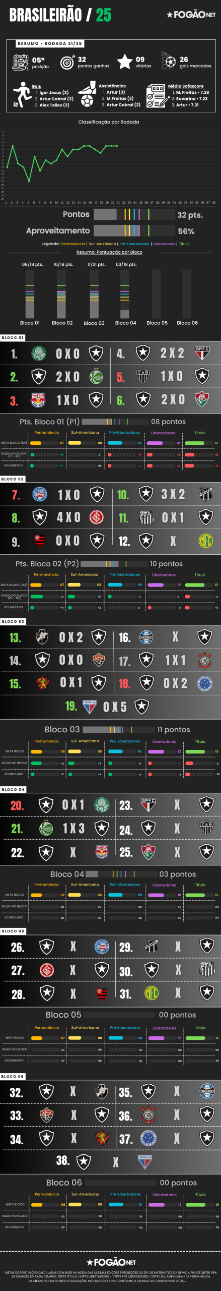 Na análise por blocos, o Botafogo ainda tem dois jogos a realizar: contra o Mirassol (bloco 2) e contra o Grêmio (bloco 3), ambos adiados pelo calendário. Mantendo o aproveitamento atual, o desempenho projeta uma campanha de time que briga por vaga direta na Libertadores.