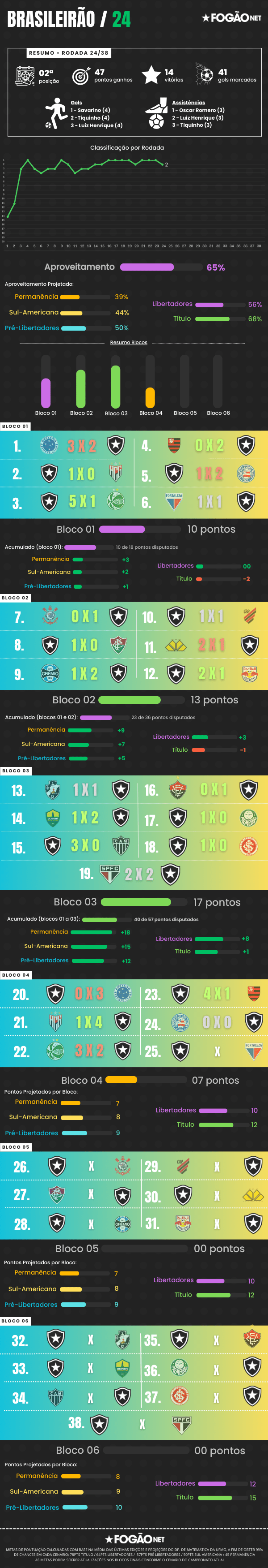 – O aproveitamento de pontos total do Botafogo está em 65%, que é a meta para quem está no bolo da Libertadores disputando o título.