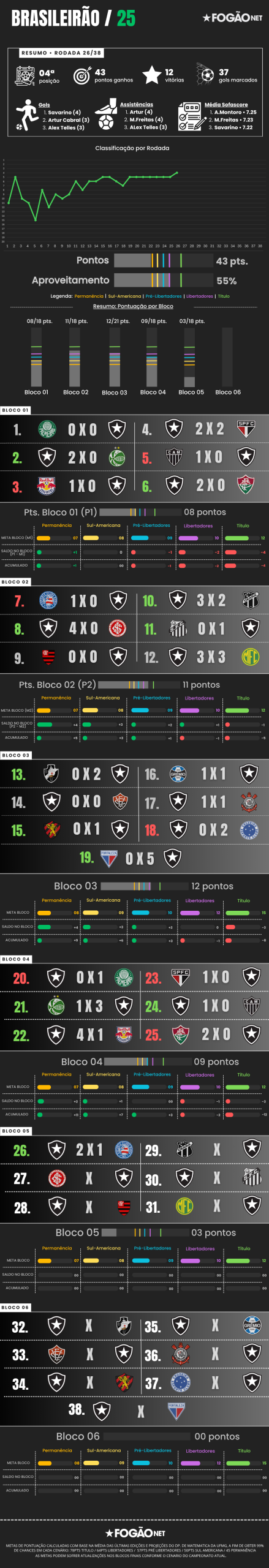 Dividimos o campeonato em seis blocos, com metas específicas de pontuação para cada fase. Essa abordagem facilita o acompanhamento por etapas, ajustando a rota a cada sequência de jogos e mantendo foco em metas de curto e médio prazo.