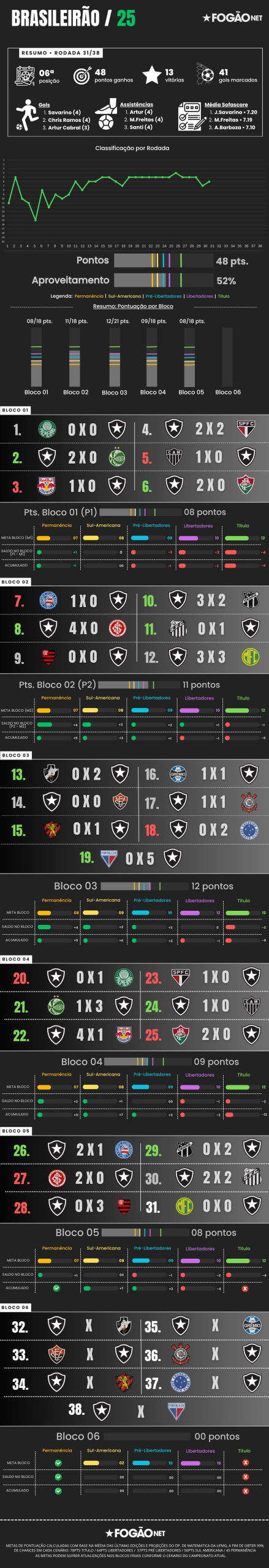 O Botafogo empatou em 0 a 0 com o Mirassol fora de casa e retornou ao G-6 após a conclusão da rodada. O clube entrará no último bloco (Bloco 06) já sem chances matemáticas de alcançar os 75 pontos que costumam garantir a disputa do título, situação previamente indicada no InfoBlocos.