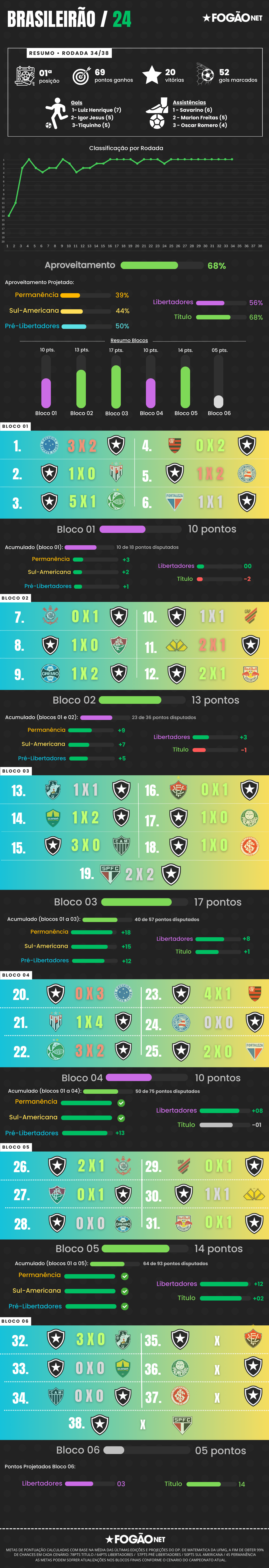 – A pontuação projetada para o último bloco foi ajustada conforme estudo do departamento de matemática d aUFMG, em 01/11/24. que indica 99% de chances de um evento ocorrer: 78 pontos para o título, a mesma de nosso acompanhamento desde a rodada 01. Nessa reta final, a pontuação estimada pode sofrer alterações ao fim de cada rodada, apresentando tendência de queda.