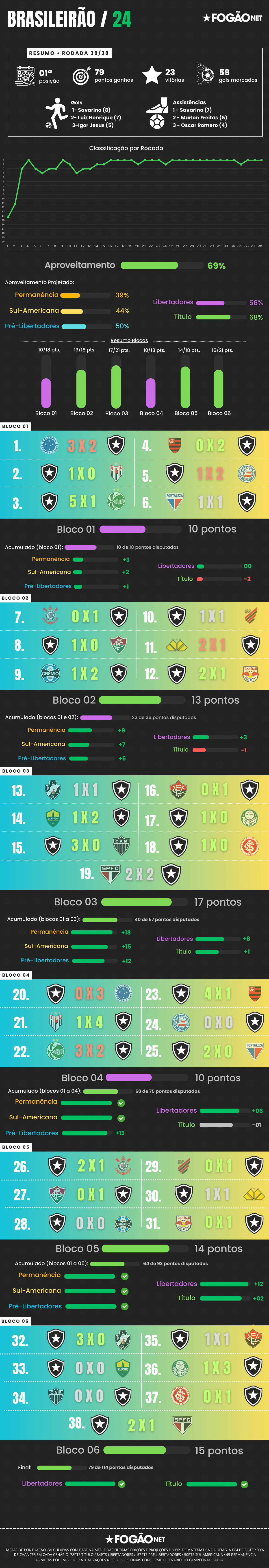 A projeção por blocos divide o campeonato em seis fases, permitindo o acompanhamento de metas de curto e médio prazo. Cada um dos seis blocos tem uma meta de pontos pré-definida, baseada em dados históricos da competição. As metas por bloco variam entre pontuação necessária para fugir do rebaixamento e pontuação de equipe que disputa o título. Dessa forma, conseguimos identificar o desempenho da equipe em cada um dos seis blocos do campeonato.