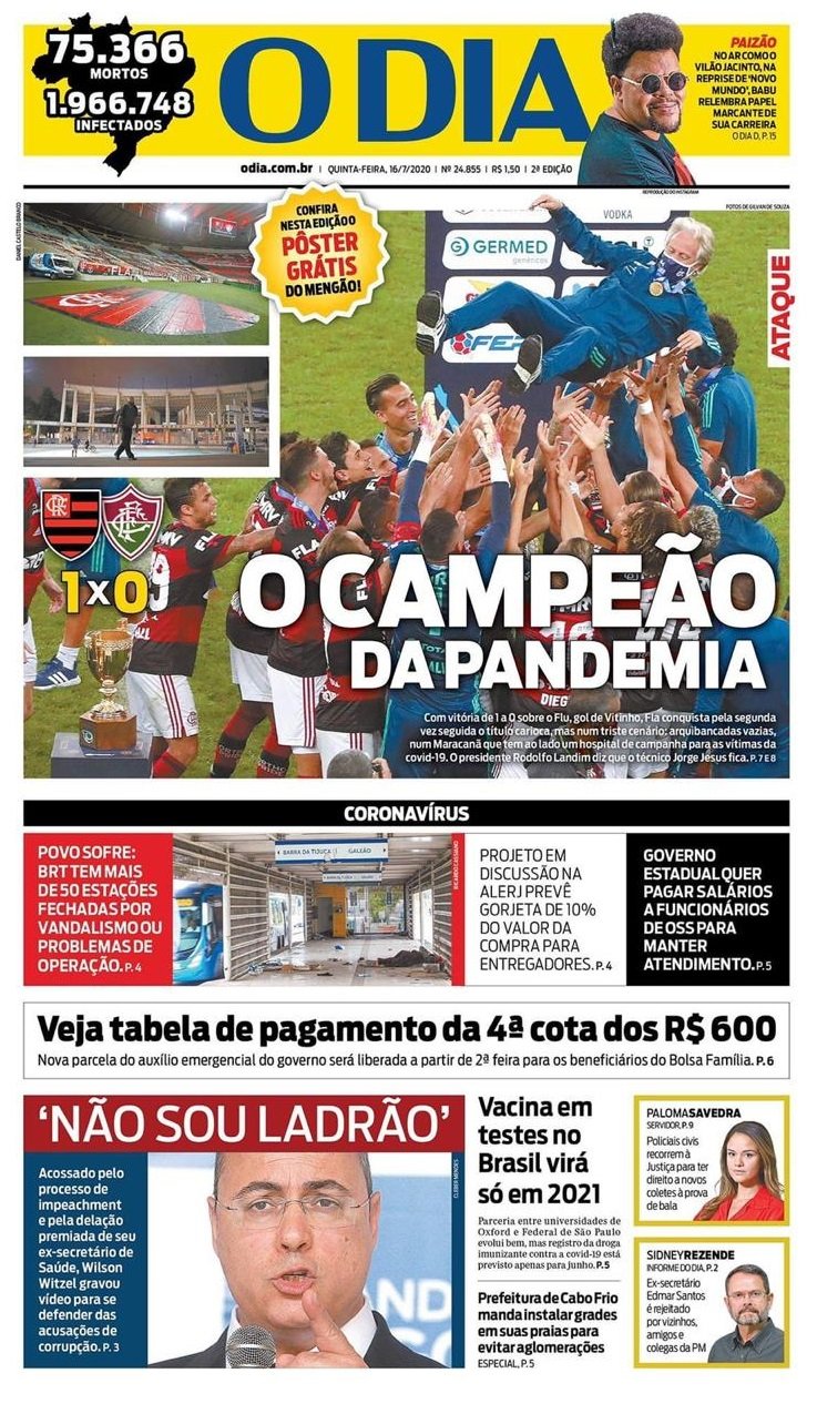 Como levantado pelo leitor Wesley Machado nos comentários aqui do site, o jornal carioca “O Dia” trouxe a manchete “Campeão da Pandemia” em tom crítico à disputa em meio ao cenário de coronavírus. Fica o registro abaixo: