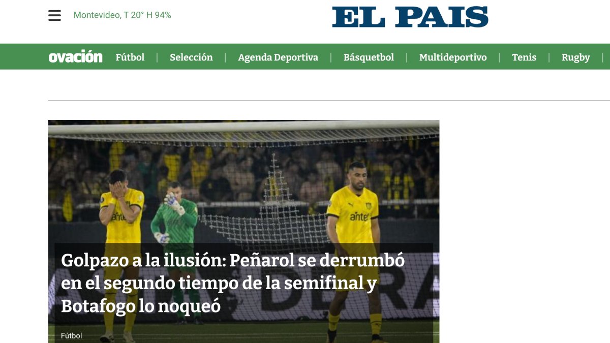 O “El País“, do Uruguai, que fez uma dedicada cobertura do dia dos aurinegros no Rio de Janeiro desde cedo, escolheu para capa do portal a seguinte manchete: “Um grande golpe no sonho: Peñarol ruiu no segundo tempo da semifinal e foi nocauteado pelo Botafogo”.