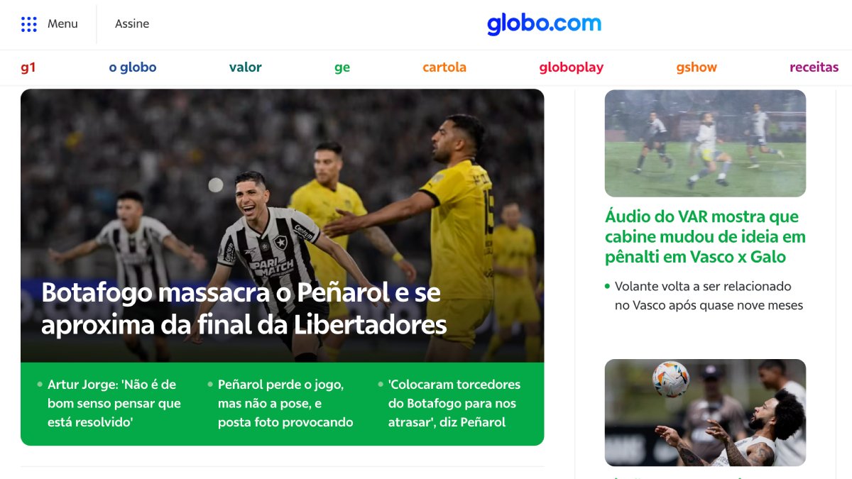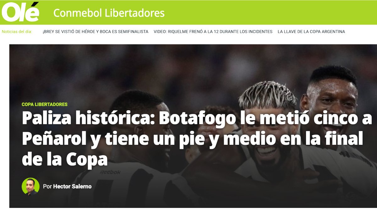 A começar pelos principais portais do Brasil. O “Globo.com” manchetou: “Botafogo massacra o Peñarol e se aproxima da final da Libertadores“. O “UOL” destacou assim: “Botafogo dá aula de futebol e faz 5 a 0 no Peñarol no 1º jogo da semifinal da Libertadores”.