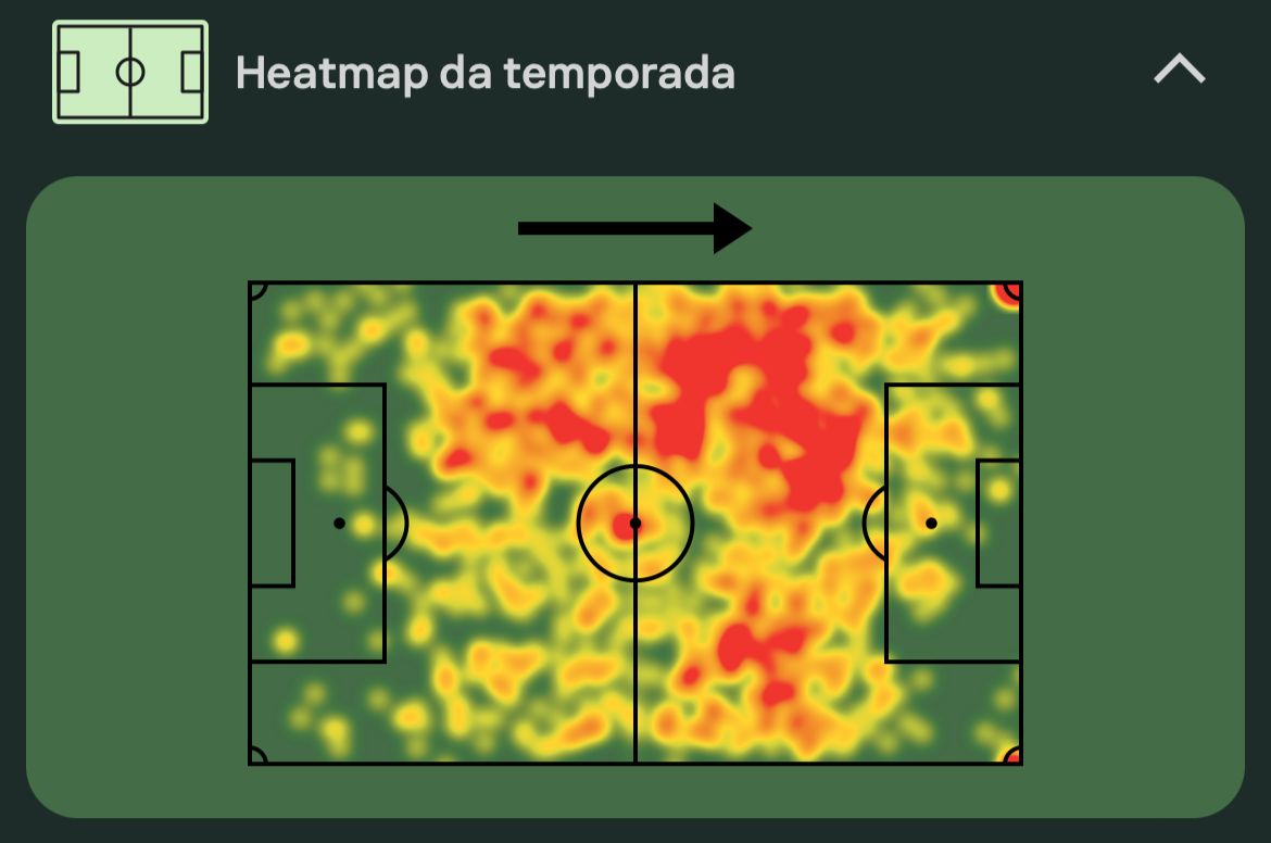 Abaixo: o seu mapa de calor na MLS 2024. Defende mais pela esquerda, ataca mais a lateral da área pela esquerda, mas na intermediária ofensiva se distribui bastante.