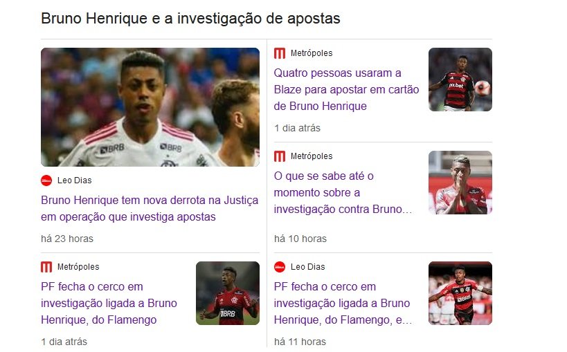O site “Metrópoles” e até o “Portal LeoDias” têm feito nos últimos dias diversas reportagens sobre Bruno Henrique, do Flamengo, e uma investigação em operação sobre apostas esportivas. O atacante é suspeito de ter recebido cartão para beneficiar apostadores, entre eles familiares.