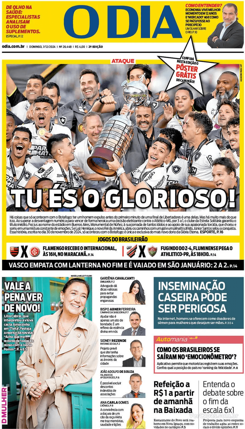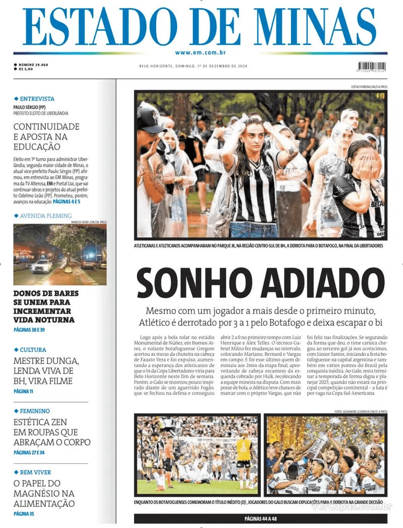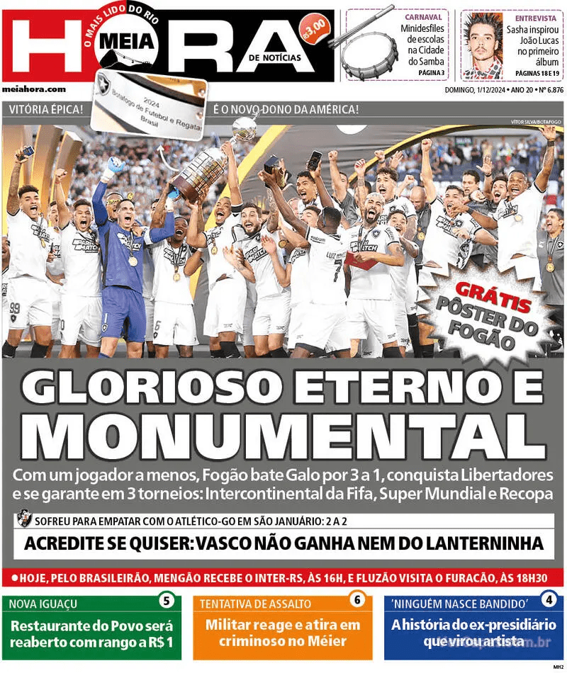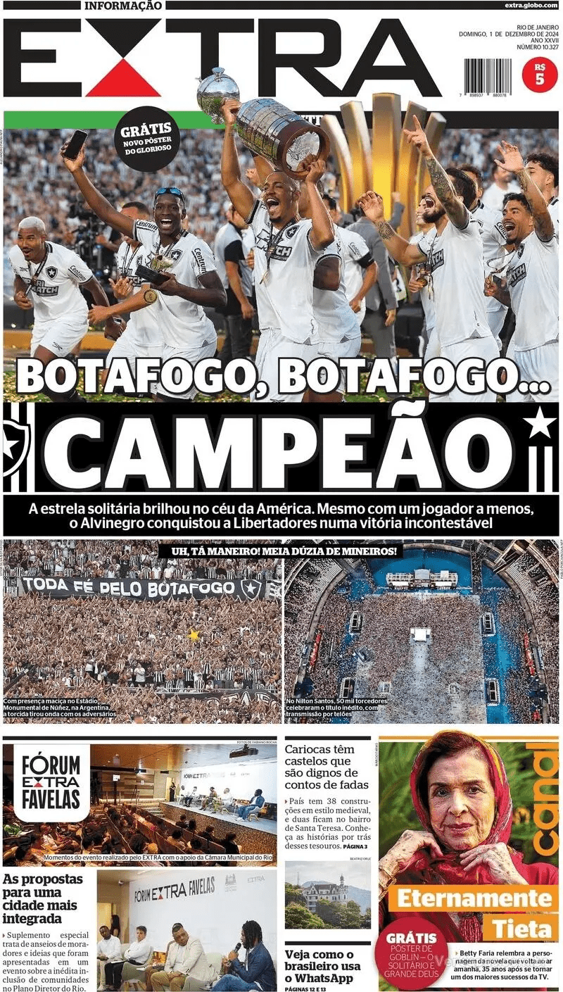 O “Extra” usou foto similar, mas destacou também a festa da torcida no Mâs Monumental e no Estádio Nilton Santos. Já o “Meia Hora” resumiu bem o título alvinegro: “Glorioso eterno e monumental”.