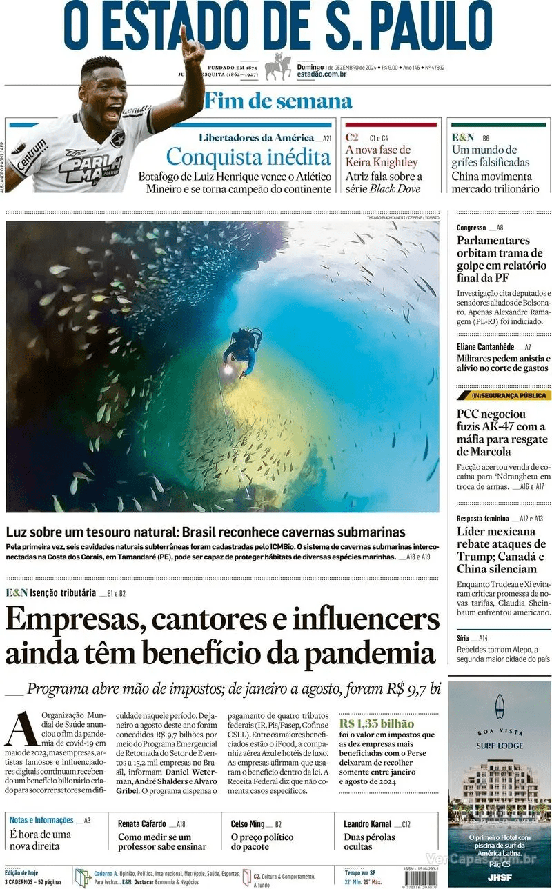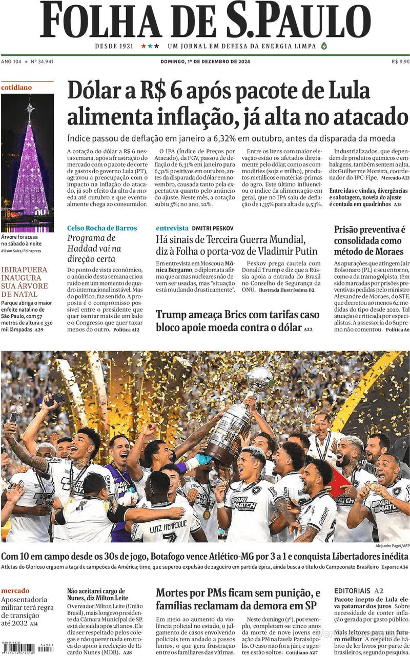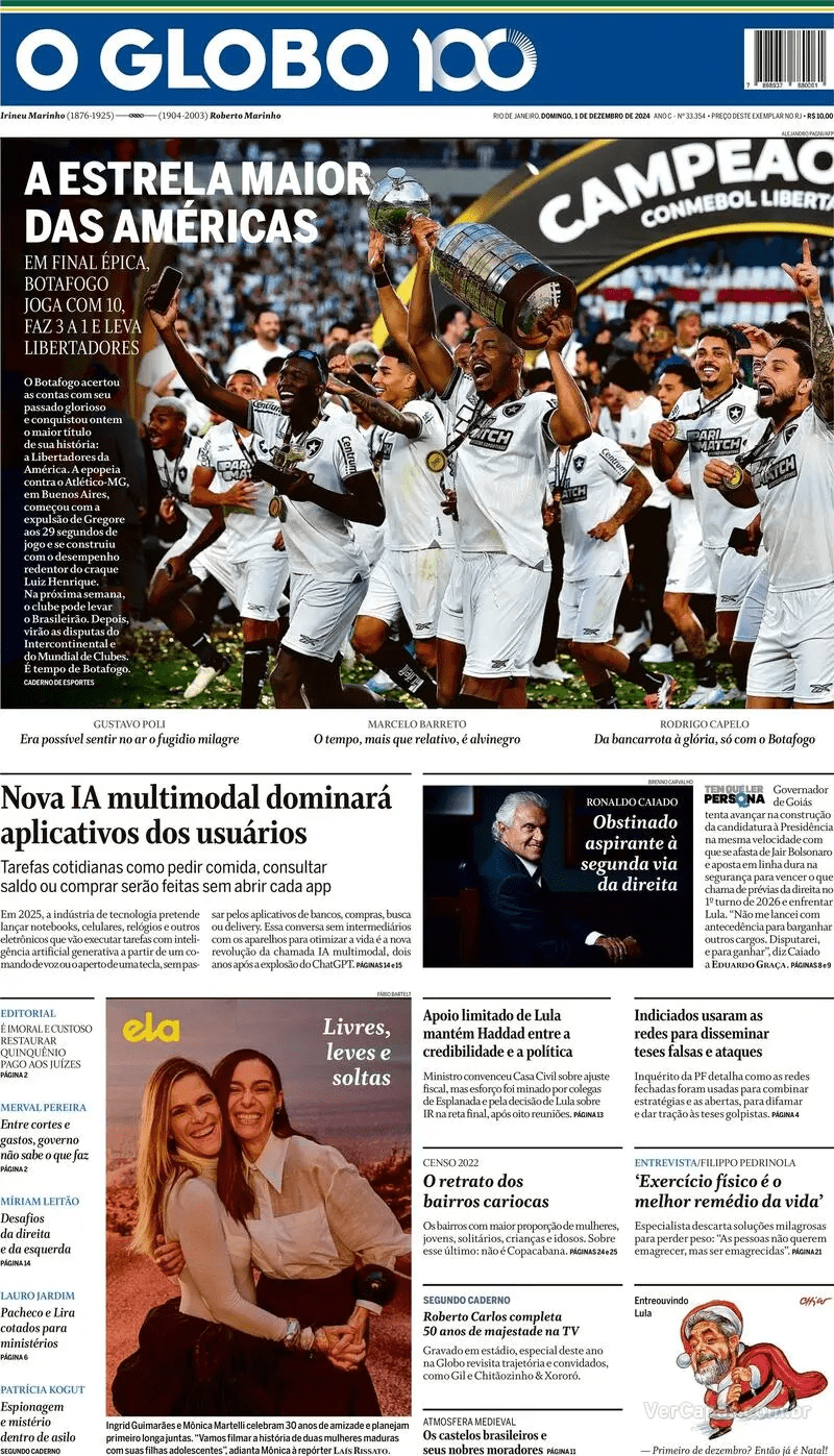 O “Extra” usou foto similar, mas destacou também a festa da torcida no Mâs Monumental e no Estádio Nilton Santos. Já o “Meia Hora” resumiu bem o título alvinegro: “Glorioso eterno e monumental”.