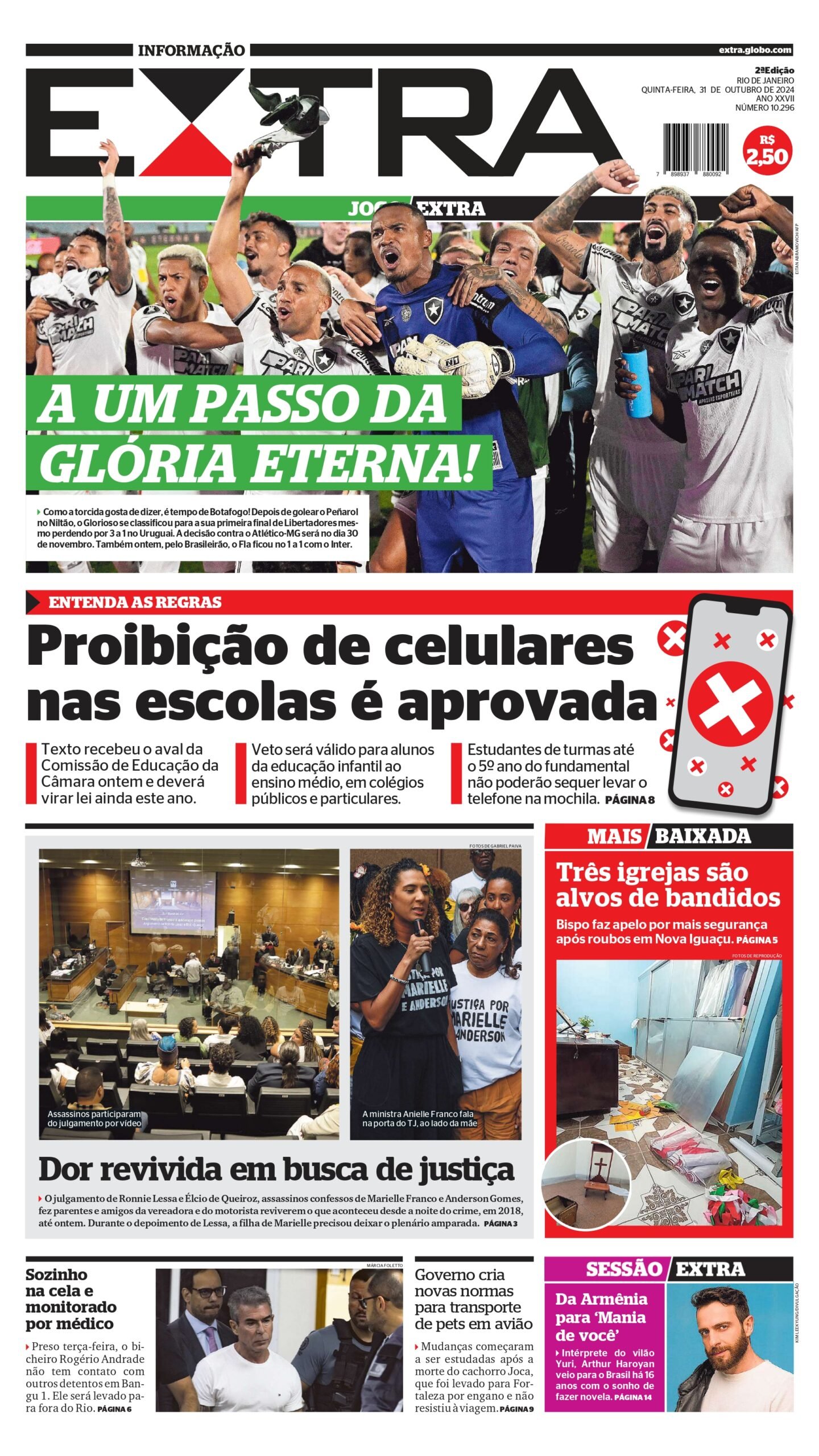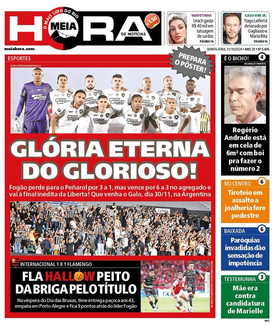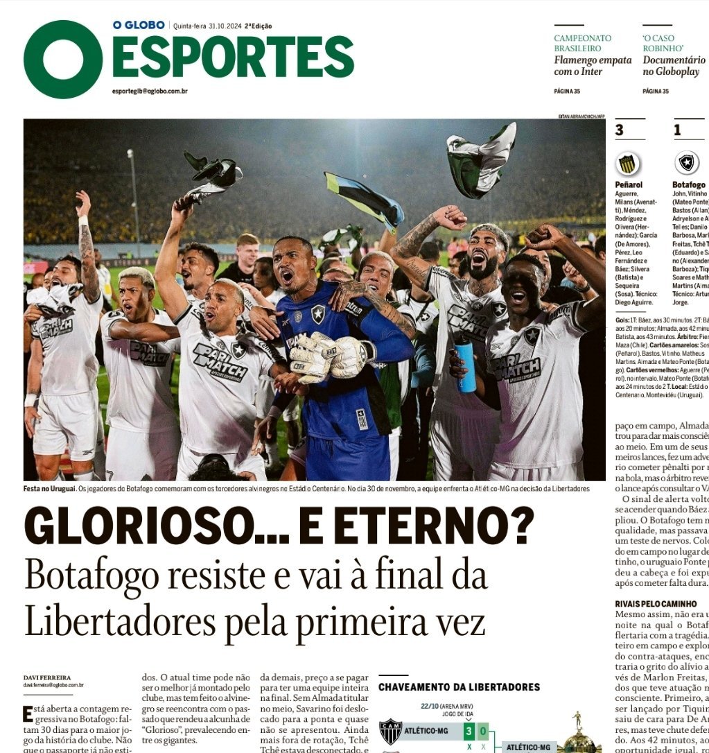 Os jornais do Rio de Janeiro deram nesta quinta-feira (31/10) destaque à classificação inédita do Botafogo para a final da Libertadores, depois de superar o Peñarol com placar agregado de 6 a 3.