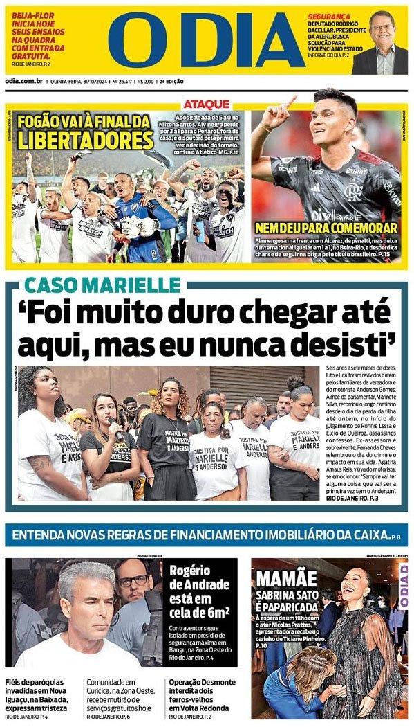 Já “O Dia” foi mais protocolar e usou a manchete “Fogão vai à final da Libertadores”. O jornal “O Globo“, por sua vez, usou apenas um pequeno pedaço em sua capa para falar do Botafogo, “a um mês da maior glória internacional“.