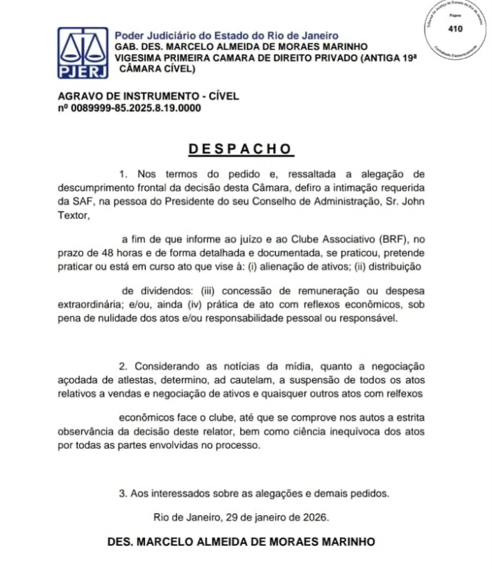 O despacho do desembargador Marcelo Almeida de Moraes Marinho, da 21ª Câmara de Direito Privado do Tribunal de Justiça do Rio, intima John Textor que informe se ele “praticou, pretende praticar ou está em curso” atos como alienação de ativos, distribuição de dividendos, concessão de remuneração ou despesas extraordinárias e práticas “com reflexos econômicos”, “sob pena de nulidade dos atos e/ou responsabilidade pessoal ou responsável”.