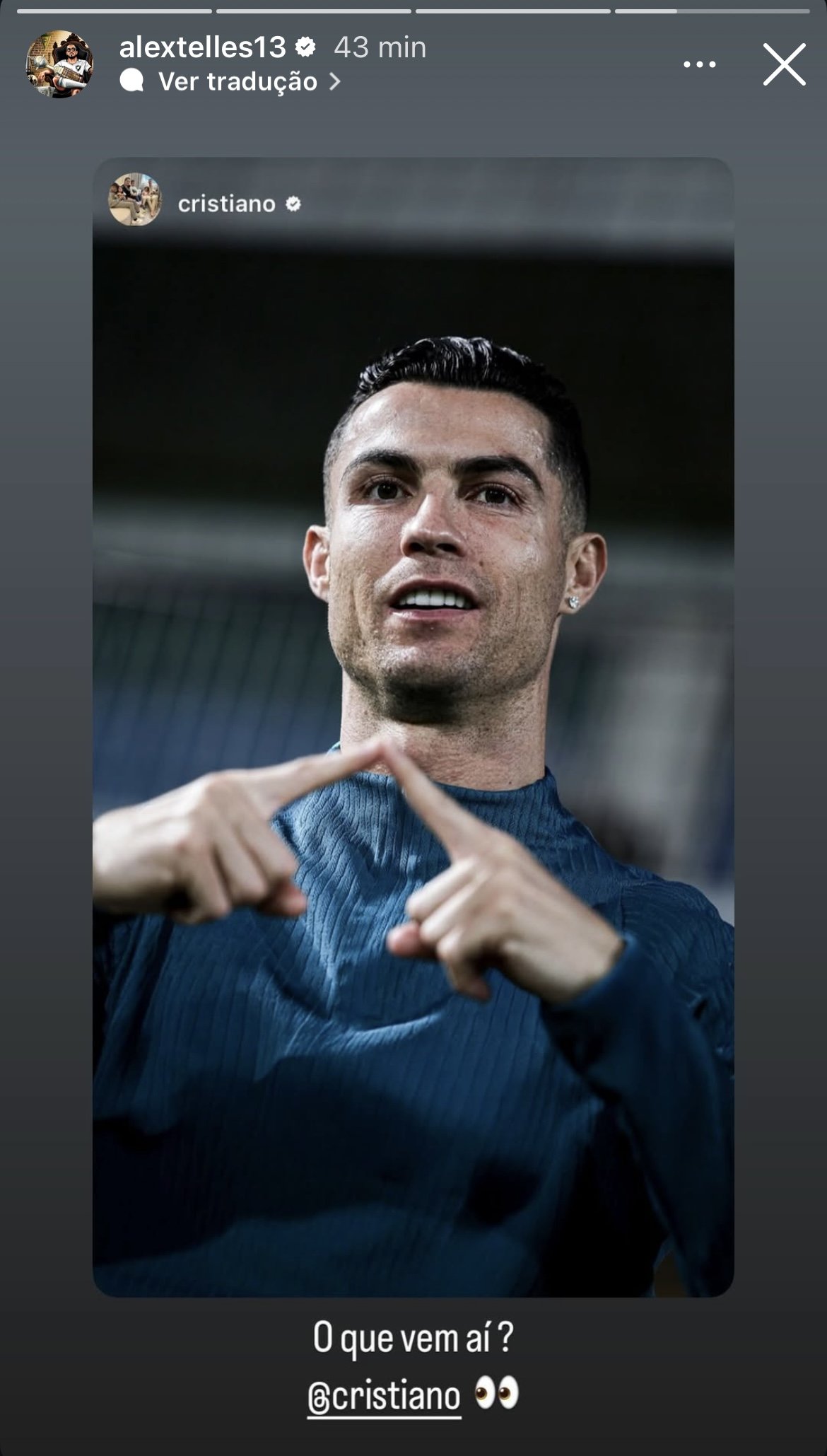 No post, compartilhado no Instagram, Alex Telles repostou uma foto de Cristiano Ronaldo com a legenda “O que vem aí?”. Os dois atuaram juntos no Manchester United e no Al-Nassr, atual clube do astro português.