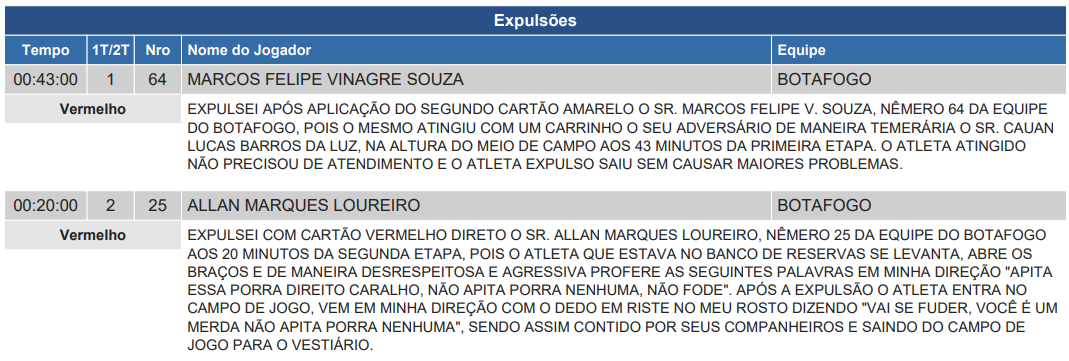 “(…) Abre os braços e de maneira desrespeitosa e ofensiva profere as seguintes palavras em minha direção: ‘Apita essa porra direito, caralho, não apita porra nenhuma, não fode’. Após a expulsão, o atleta entra no campo de jogo, vem em minha direção com o dedo em riste no meu rosto dizendo: ‘Vai se fuder [sic], você é um merda, não apita porra nenhuma’, sendo contido por seus companheiros e saindo do campo de jogo para o vestiário“, escreveu Yuri (veja abaixo).