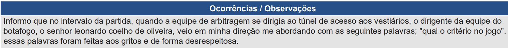 “Informo que no intervalo da partida, quando a equipe de arbitragem se dirigia ao túnel de acesso aos vestiários, o dirigente da equipe do Botafogo, o sr. Leonardo Coelho de Oliveira, veio em minha direção me abordando com as seguintes palavras: ‘Qual o critério no jogo’. Essas palavras foram feitas aos gritos e de forma desrespeitosa“, relatou Wagner.