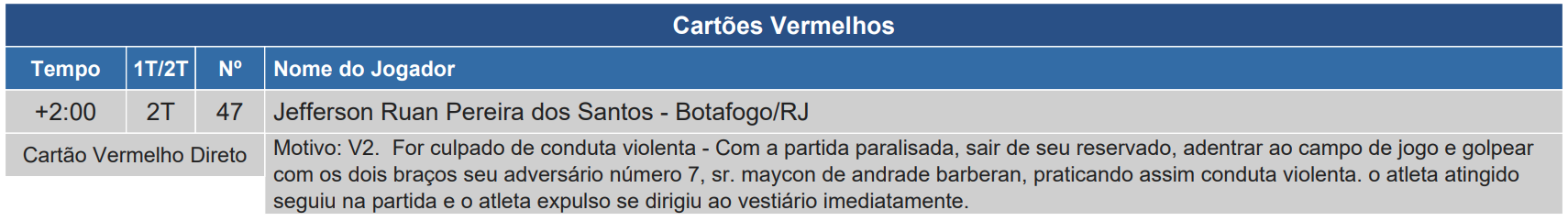 “Com a partida paralisada, sair de seu reservado, adentrar ao campo de jogo e golpear com os dois braços seu adversário de número 7, Sr. Maycon de Andrade Barberan, praticando assim conduta violenta. O atleta atingido seguiu na partida e o atleta expulso se dirigiu ao vestiário imediatamente“, escreveu o árbitro.