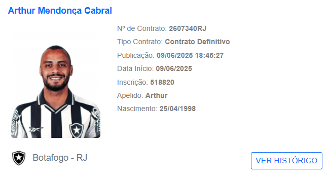 Contratado junto ao Benfica por € 12 milhões fixos mais € 3 milhões em bôns por metas (numa operação que pode chegar, portanto, a R$ 95,3 milhões), Arthur Cabral assinou com o Botafogo até o fim de 2028.