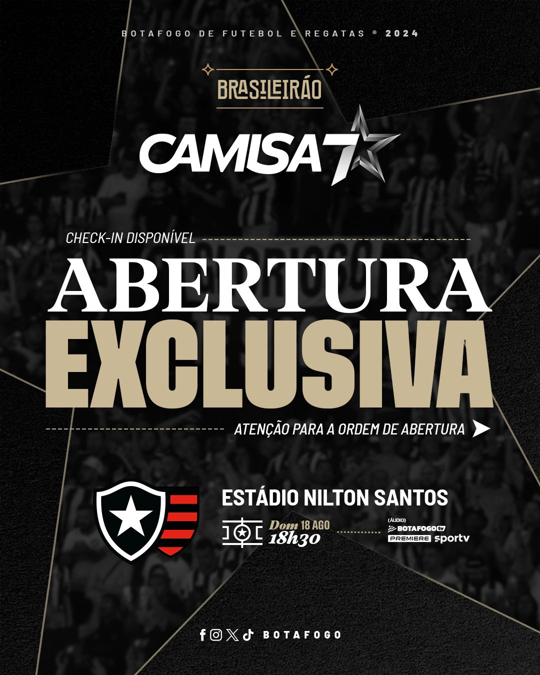 É clássico! O Botafogo recebe o Flamengo no dia 18 de agosto, às 18h30, no Estádio Nilton Santos, pelo Campeonato Brasileiro-2024. Sócios do Plano Glorioso já podem fazer o check-in para a partida em botafogo.com.br/ingresso. A venda para o público geral começa no dia 13!