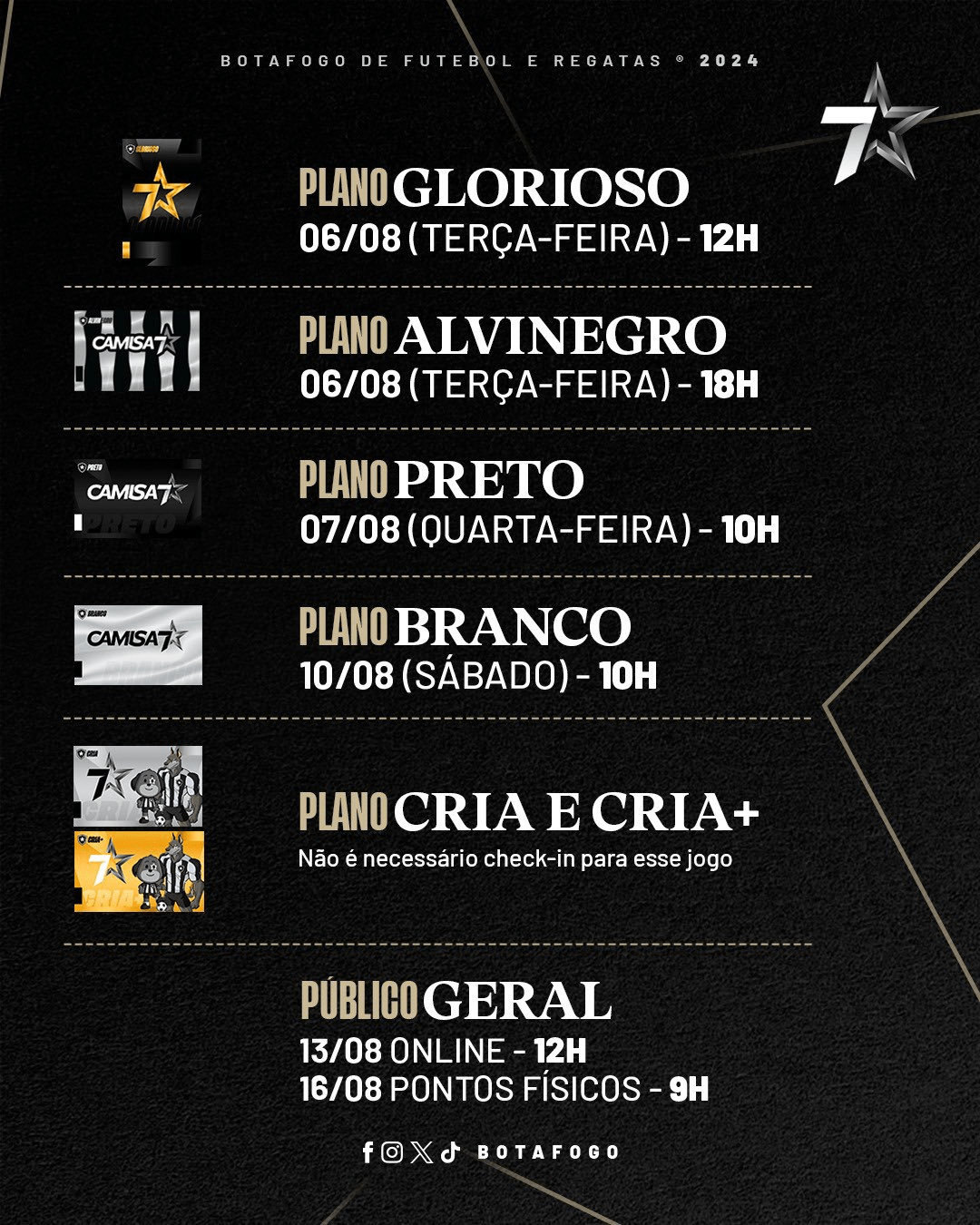 Atenção para a ordem de abertura de ingressos: Plano Glorioso (06/08, às 12), Alvinegro (06/08, às 18h), Plano Preto (07/08, às 10h), Plano Branco (10/08, às 10h), Público Geral online (13/08, às 12h), Público Geral nos Pontos de Venda (16/08, às 9h).