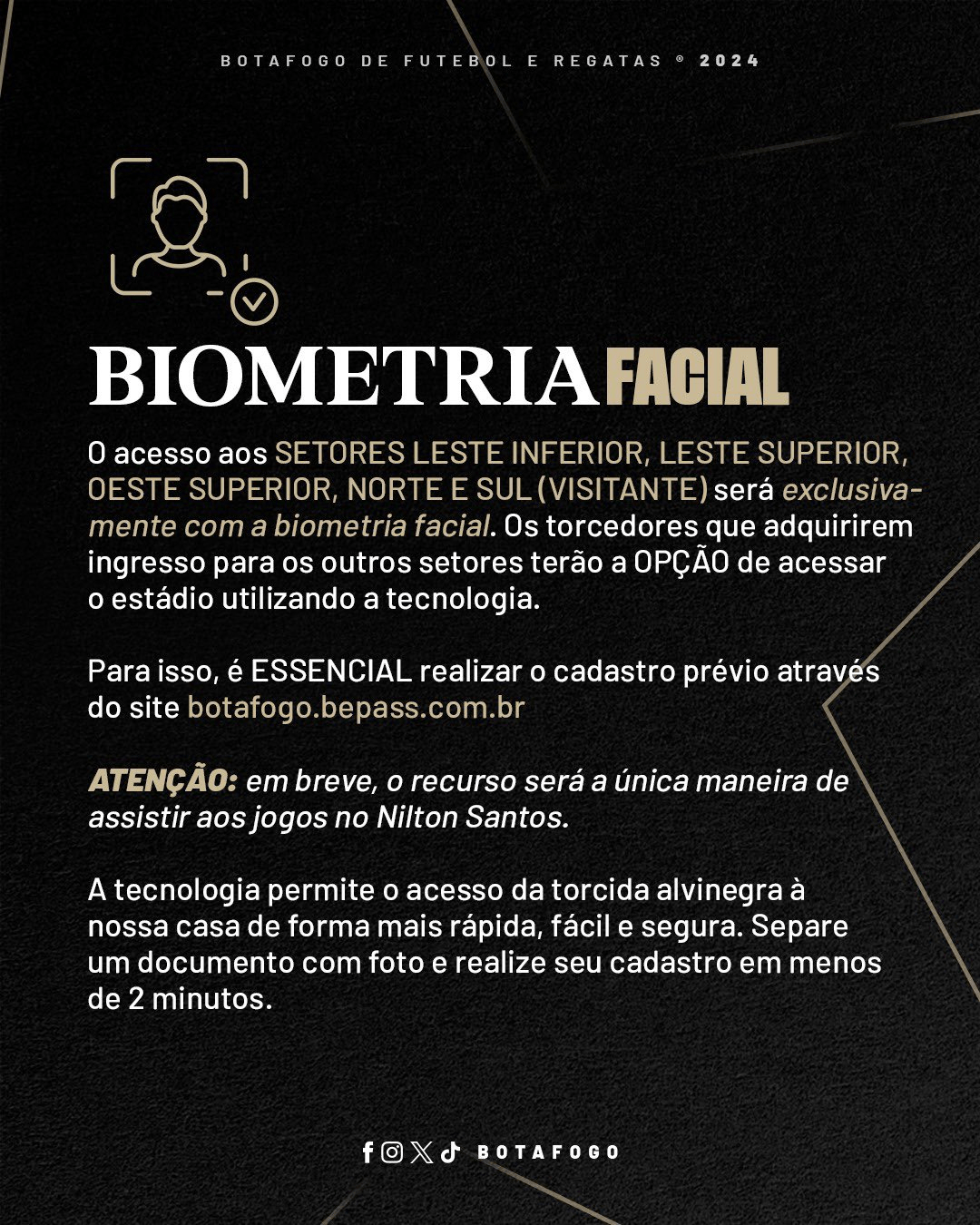 O acesso aos setores Leste Superior, Leste Inferior, Oeste Superior, Norte e Sul (visitante) será exclusivamente pela biometria facial. Os torcedores que adquirirem ingresso para os outros setores terão a OPÇÃO de acessar o estádio utilizando a tecnologia. Para isso, é ESSENCIAL realizar o cadastro prévio através do site botafogo.bepass.com.br