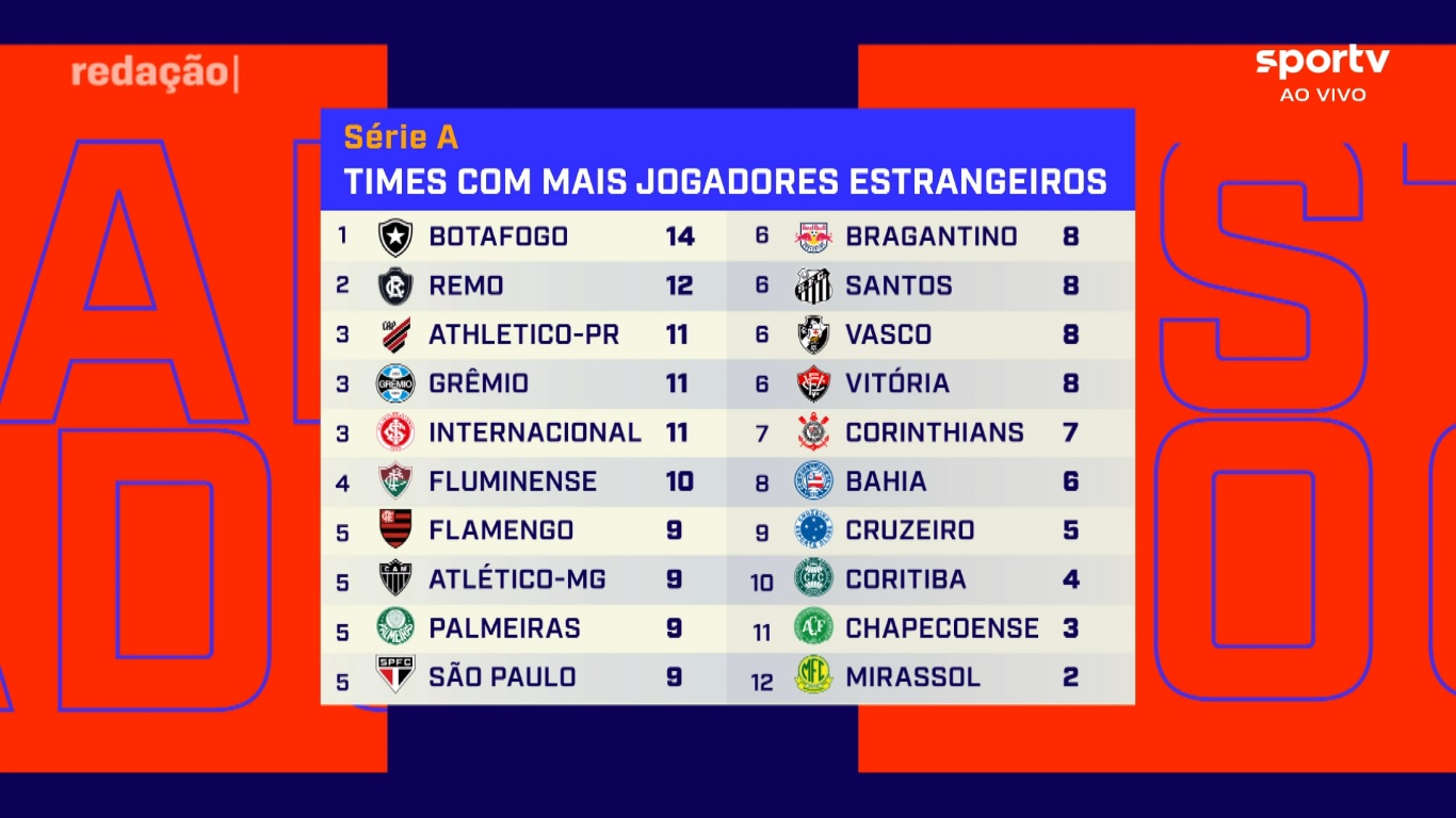 O Botafogo se isolou no ranking de clubes brasileiros com mais jogadores estrangeiros em seu elenco em 2026. Atualmente, são 14. Levantamento do SporTV mostra que o Remo, com 12, é quem está mais perto (veja o quadro mais abaixo).
