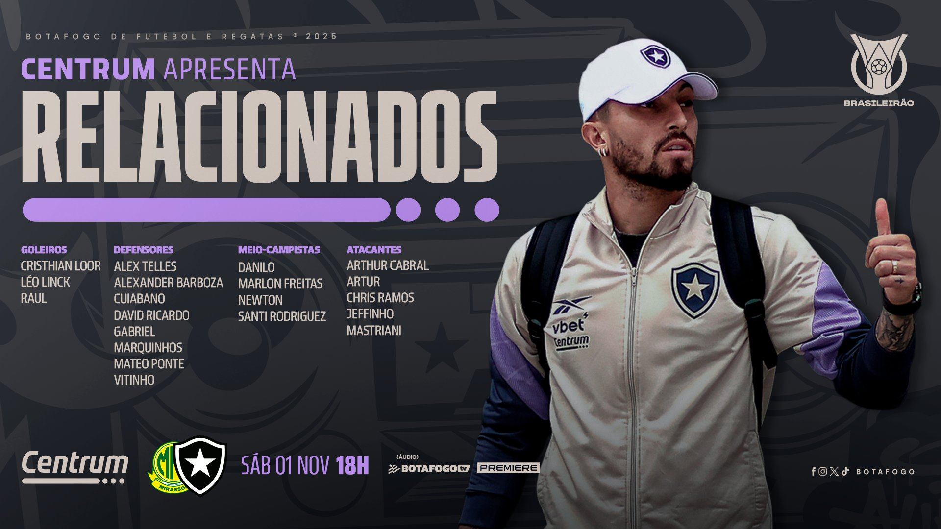 Savarino, Joaquín Correa e Marçal desfalcam o Botafogo neste sábado (1/11), contra o Mirassol, pela 31ª rodada do Campeonato Brasileiro. O clube divulgou a lista de relacionados nesta sexta-feira.
