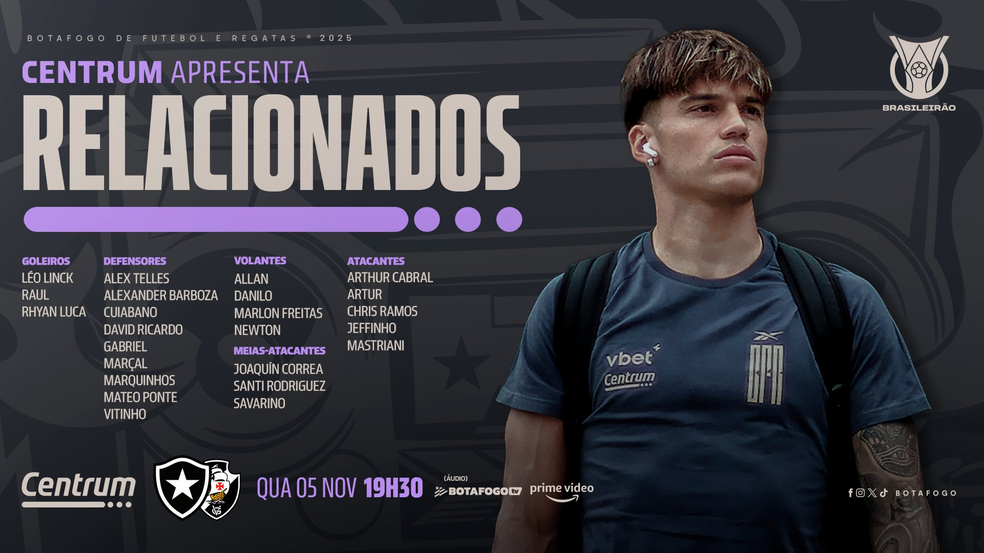 O Botafogo soltou a lista de relacionados para o clássico contra o Vasco nesta quarta-feira, às 19h30, no Estádio Nilton Santos, pela 32ª rodada do Campeonato Brasileiro, com as voltas de Marçal, Savarino e Joaquín Correa.