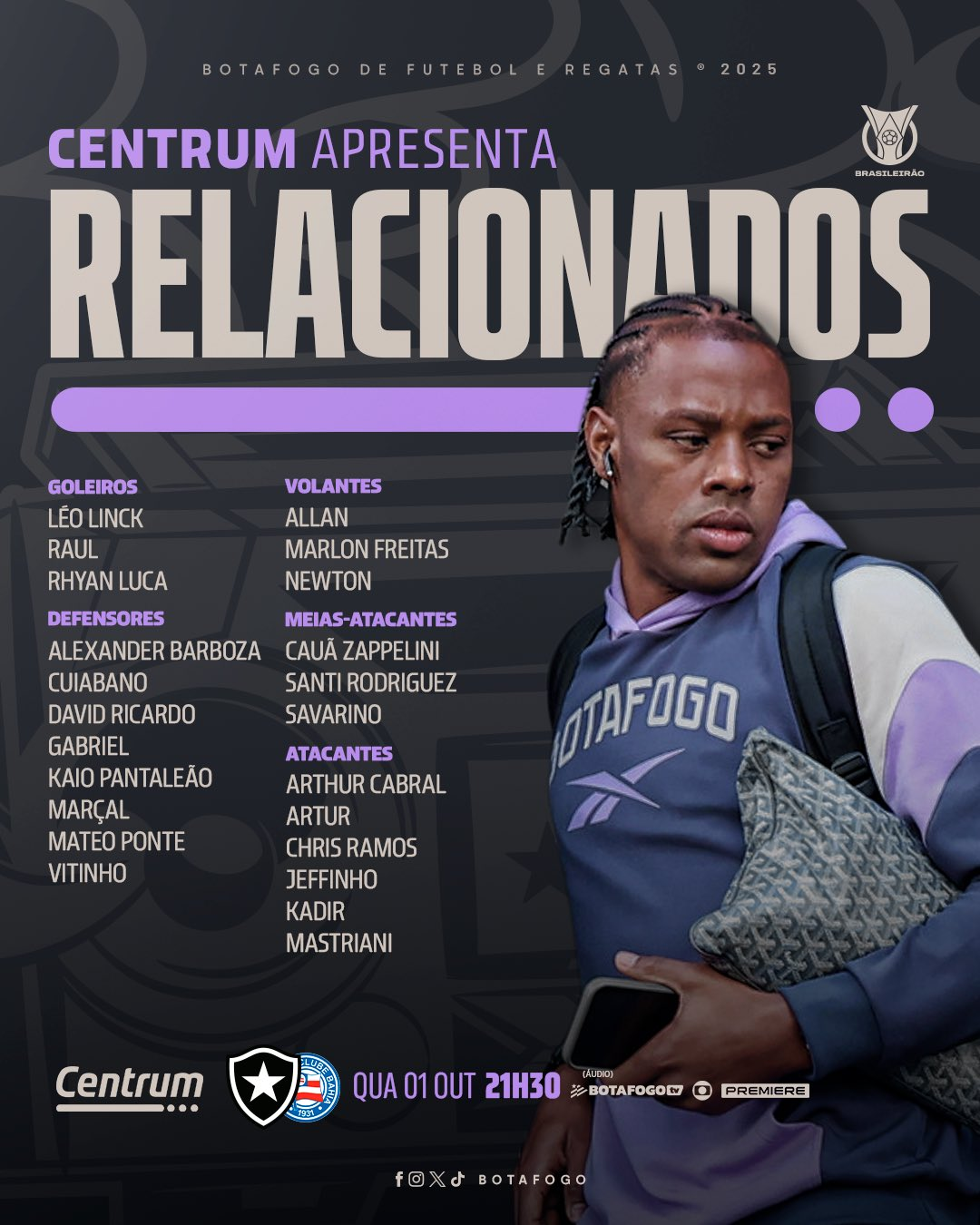 O Botafogo divulgou a lista de relacionados para enfrentar o Bahia nesta quarta-feira (1/10), às 21h30, no Estádio Nilton Santos, pela 26ª rodada do Campeonato Brasileiro. Alex Telles, com dores no joelho, e Joaquín Correa, com uma lesão muscular, seguem fora.
