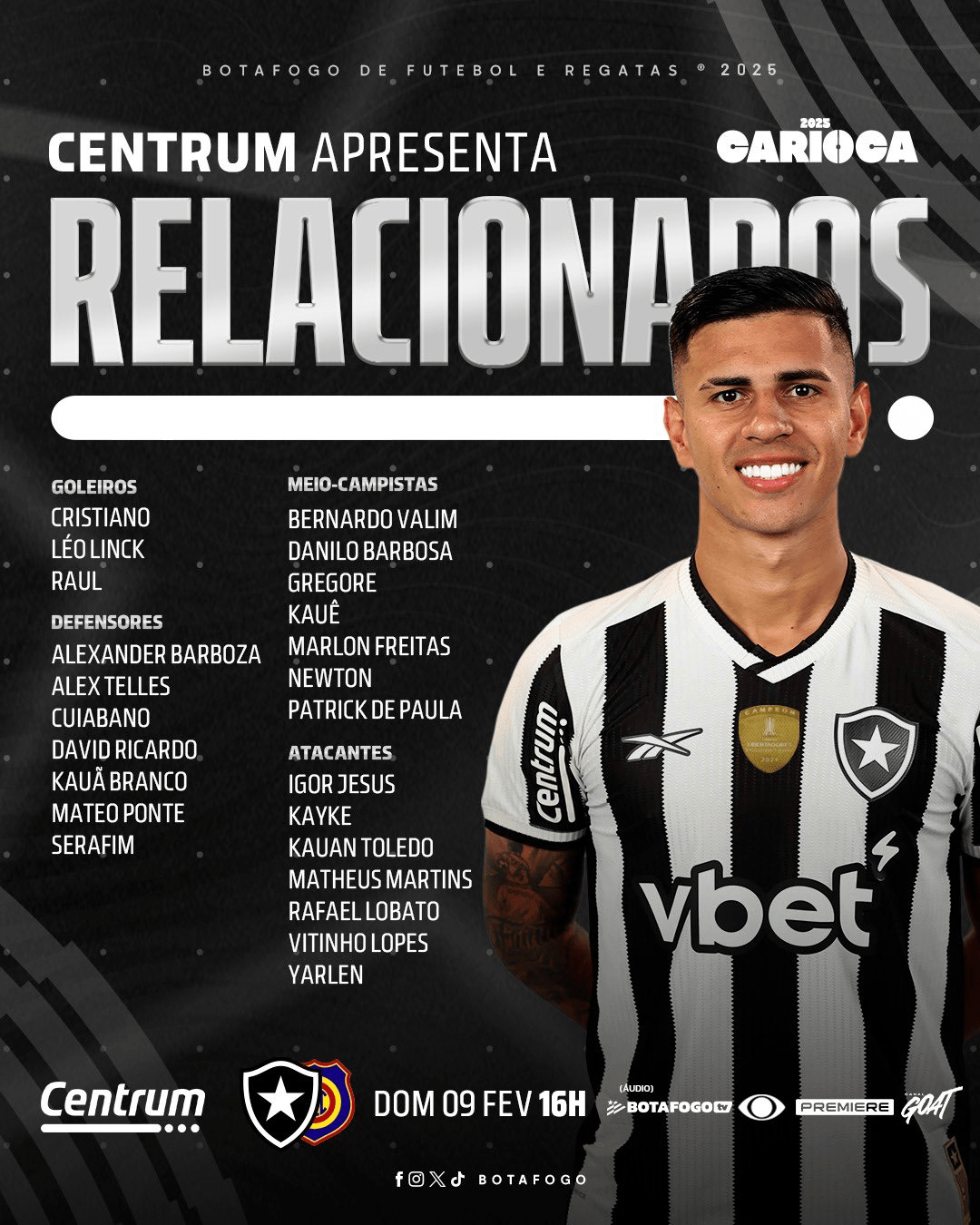 O Botafogo divulgou a lista de relacionados para enfrentar o Madureira neste domingo, no Estádio Kleber Andrade, em Cariacica. John, Bastos, Vitinho, Savarino e Artur não viajaram para o Espírito Santo.
