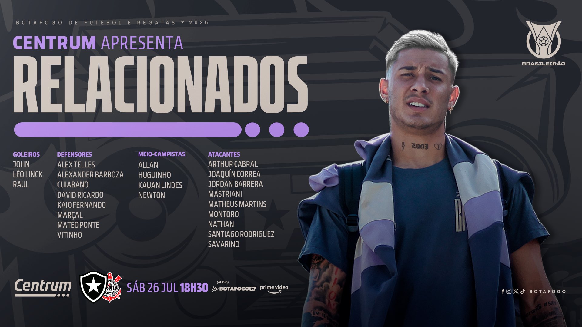 O Botafogo divulgou a lista de relacionados para o jogo com o Corinthians, neste sábado, no Estádio Nilton Santos, pelo Campeonato Brasileiro. Jordan Barrera e Matheus Martins são as principais novidades na relação do técnico Davide Ancelotti.
