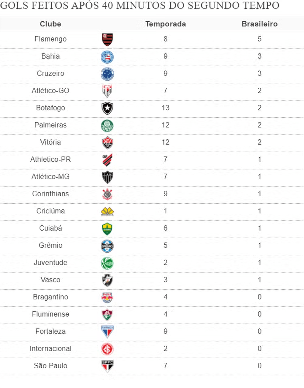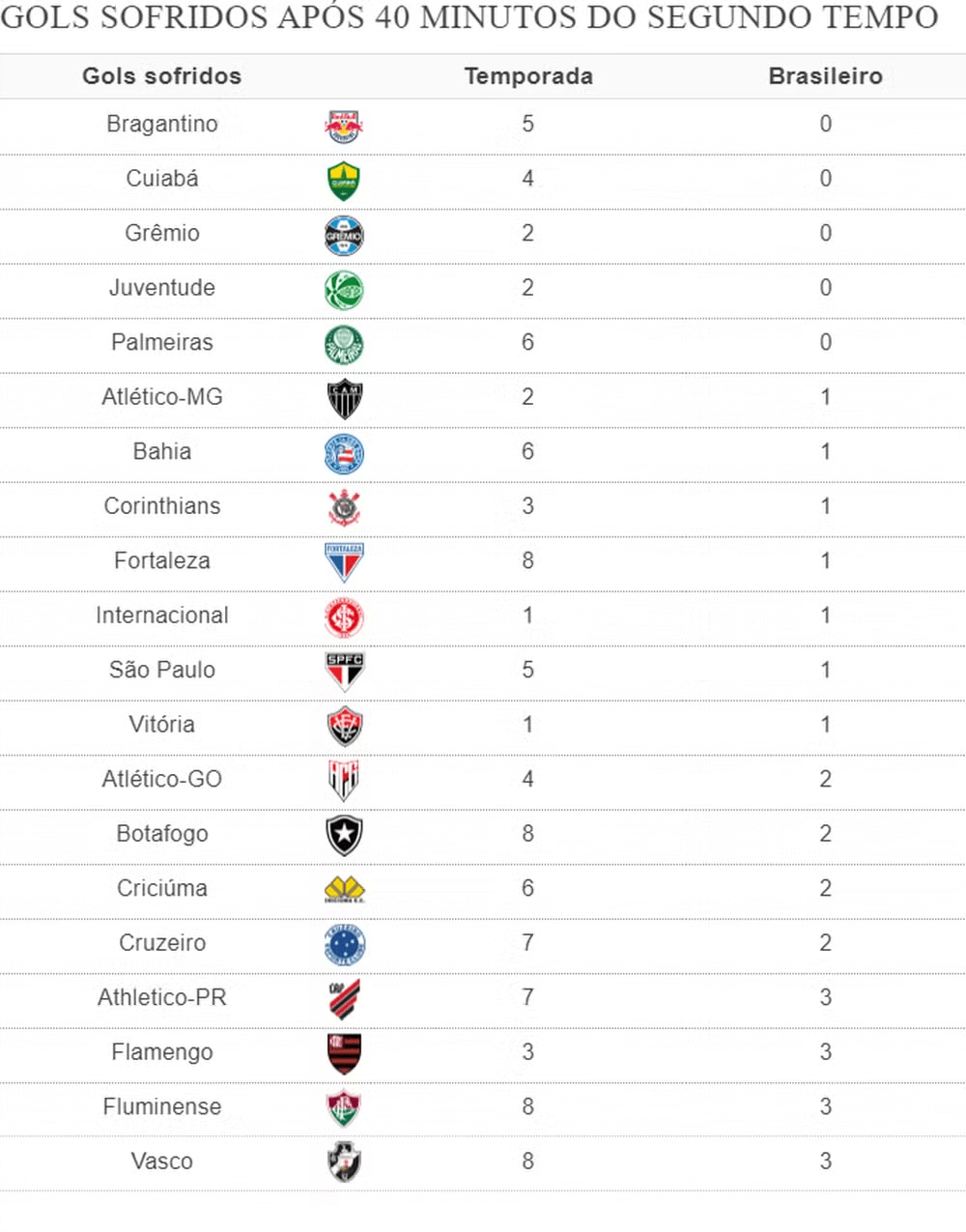 Por outro lado, o Botafogo já sofreu oito gols em 2024 após os 40 minutos do segundo tempo, liderando esse ingrato ranking ao lado de Fortaleza, Fluminense e Vasco. No Campeonato Brasileiro, foram dois gols sofridos pelo Fogão no final.
