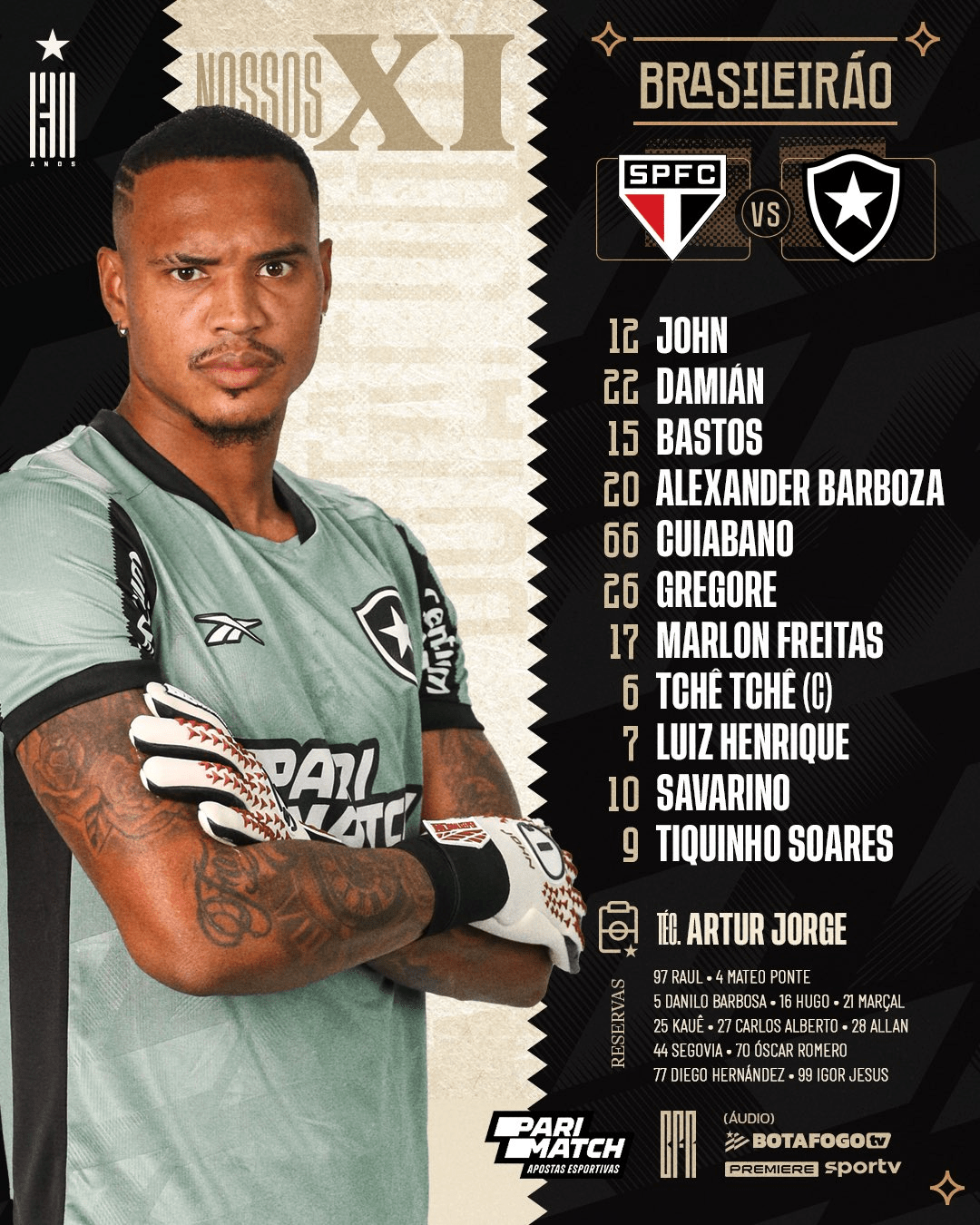 A equipe alvinegra irá a campo com John; Damián Suárez, Alexander Barboza, Bastos e Cuiabano; Gregore, Marlon Freitas e Tchê Tchê; Luiz Henrique, Tiquinho Soares e Savarino.