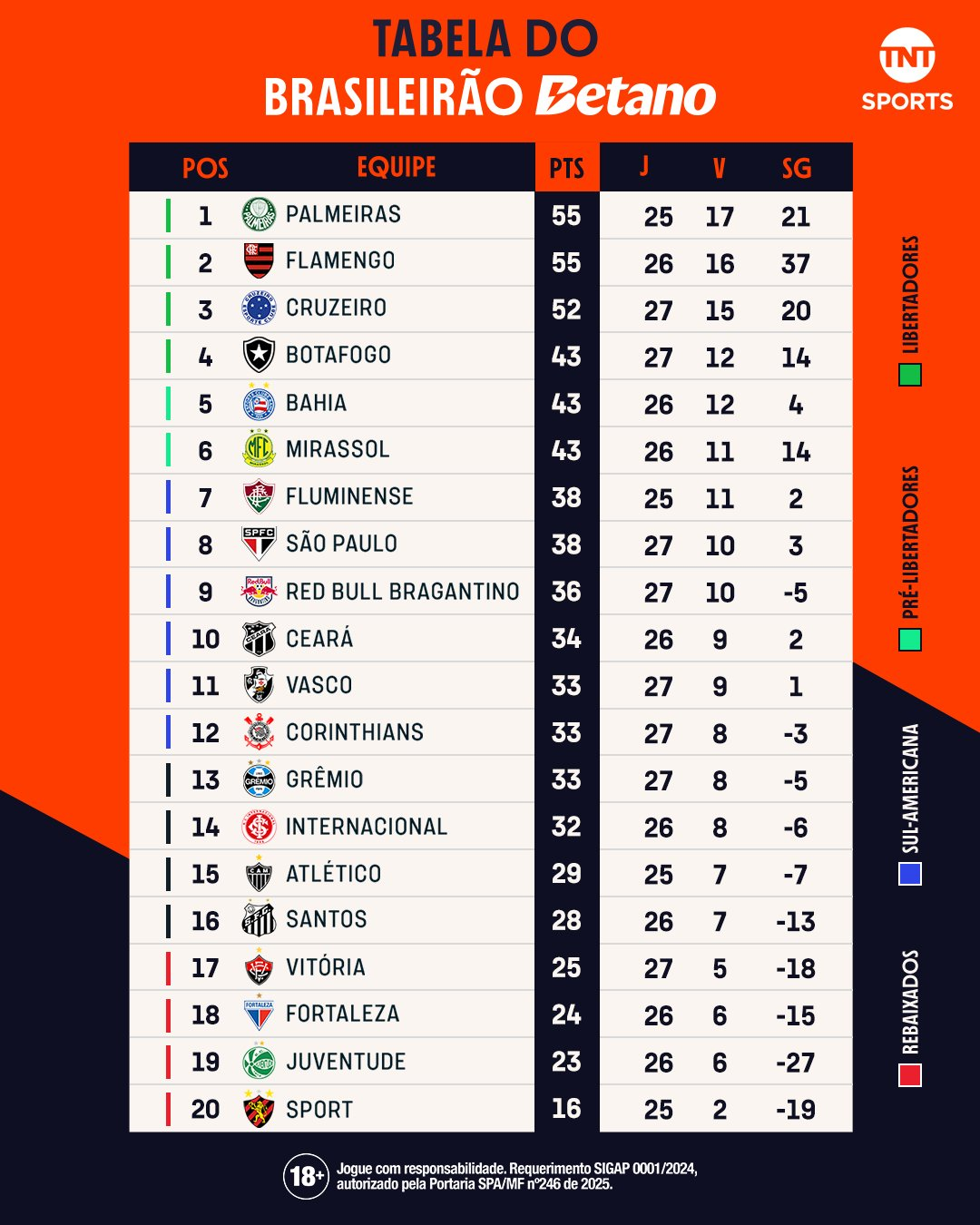 O Botafogo fechou a 27ª rodada do Campeonato Brasileiro dentro do G-4 e com os mesmos cinco pontos de vantagem na zona de classificação para a Libertadores-2026, mas viu o Bahia colar neste domingo (5/10), com a vitória tricolor sobre o Flamengo em Salvador.