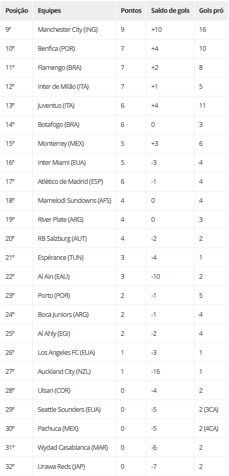 Classificação final da Copa do Mundo de Clubes-2025 (9º ao 32º):