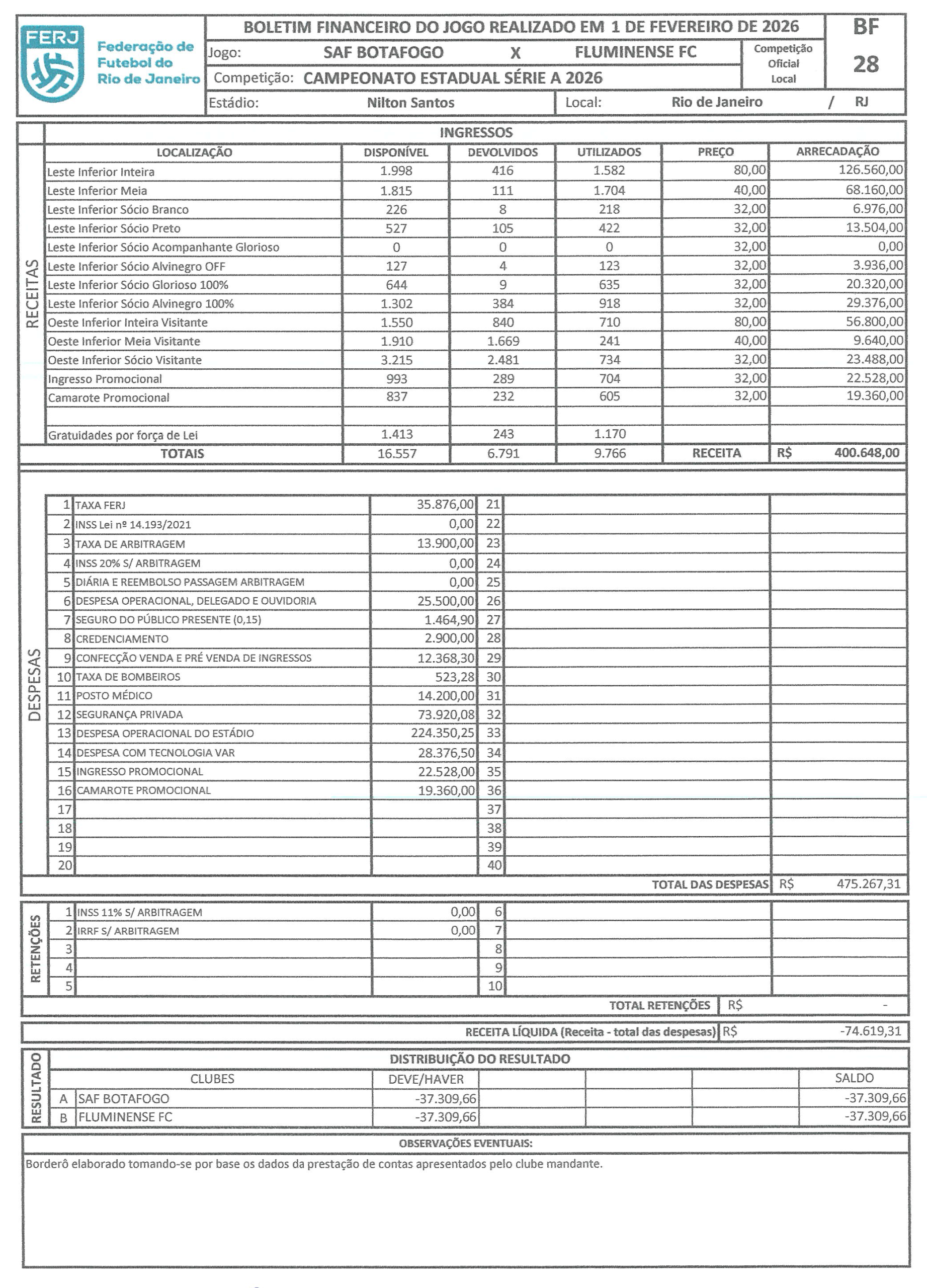 Descontando os ingressos de gratuidade, promocionais e camarotes promocionais, foram 7.287 pagantes, sendo 5.602 ocupando o setor Leste (Botafogo) e apenas 1.685 no Oeste (Fluminense), como mostra o borderô – o Glorioso colocou mais que o triplo de tricolores.