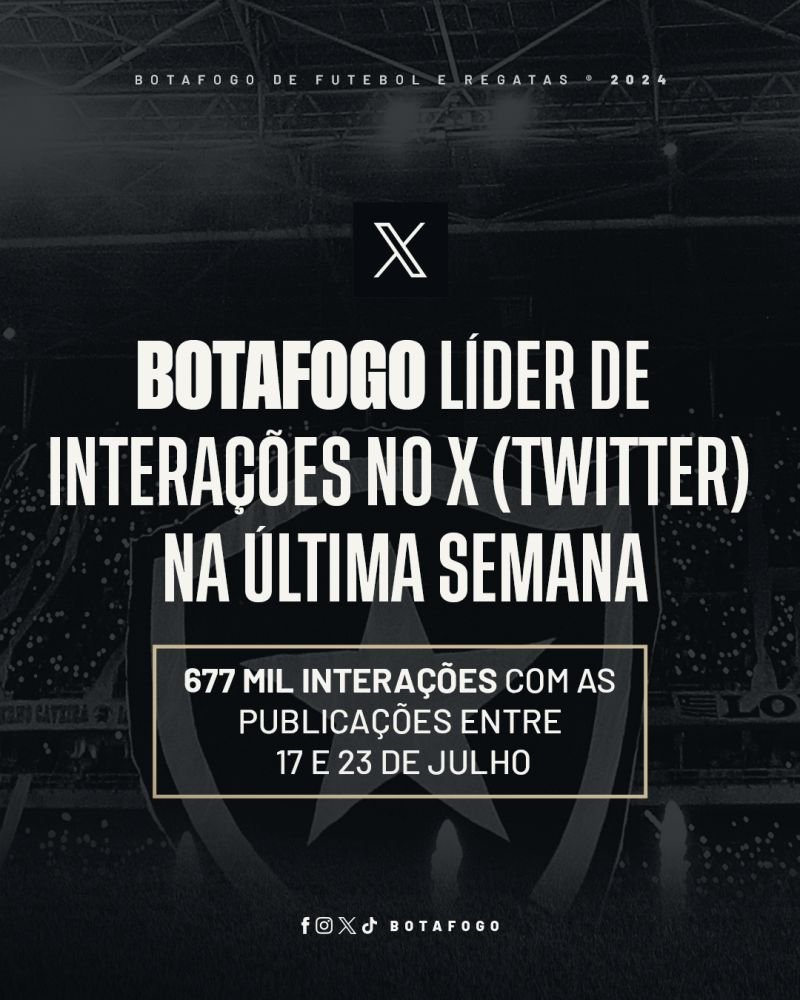 Com mais de 677 mil interações com as publicações, entre os dias 17 e 23 de julho, o Botafogo foi destaque ao garantir a liderança no ranking semanal de interações do X (Twitter) entre os clubes brasileiros. Vale destacar que, no período entre 3 a 9 de julho, o Alvinegro já havia sido o segundo time com mais interações. De forma geral, essa é a 14ª semana seguida do Glorioso no Top 10 e a 4ª seguida entre o Top 5, apresentando uma média significativa de 429 mil interações com os conteúdos na rede.
