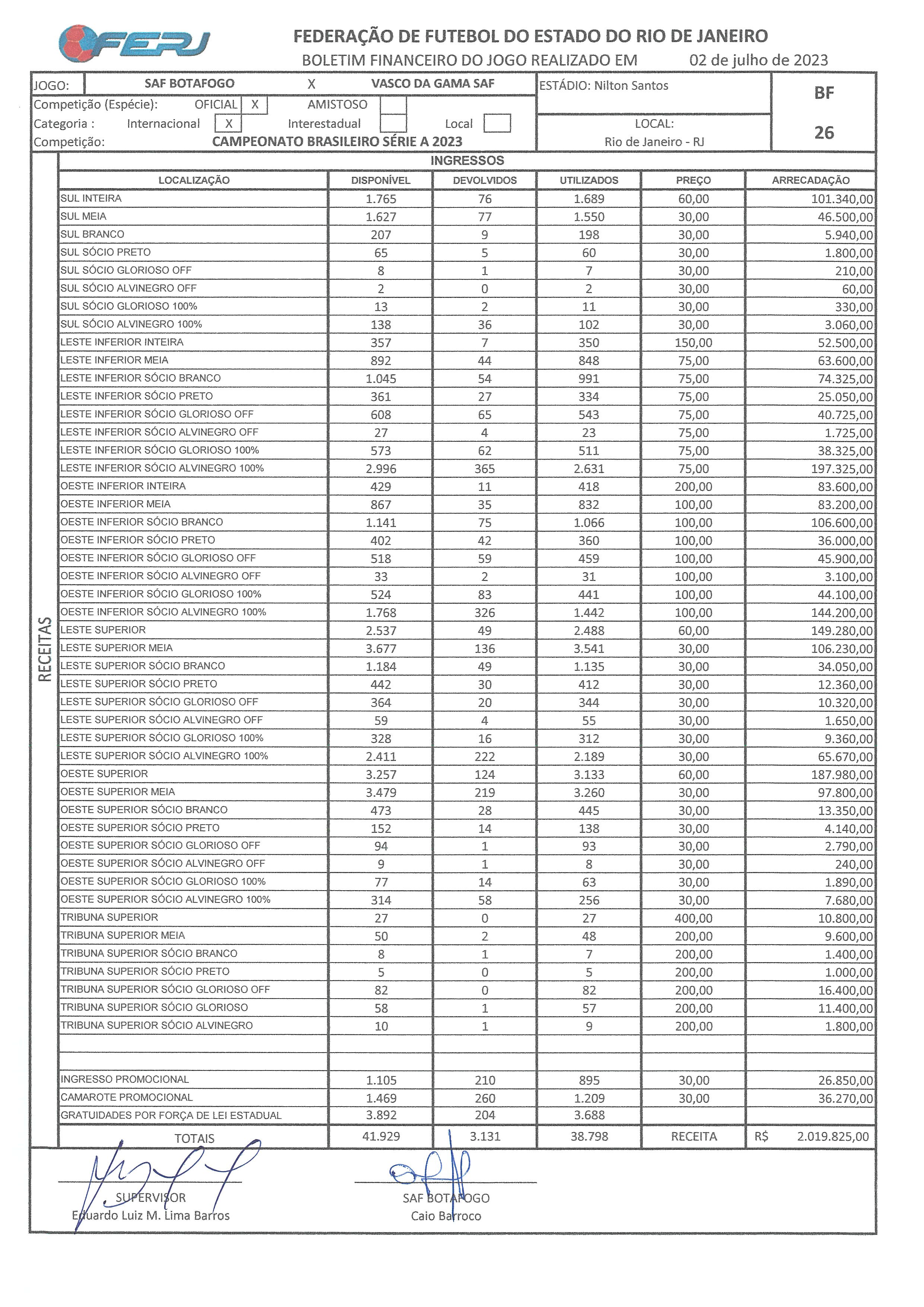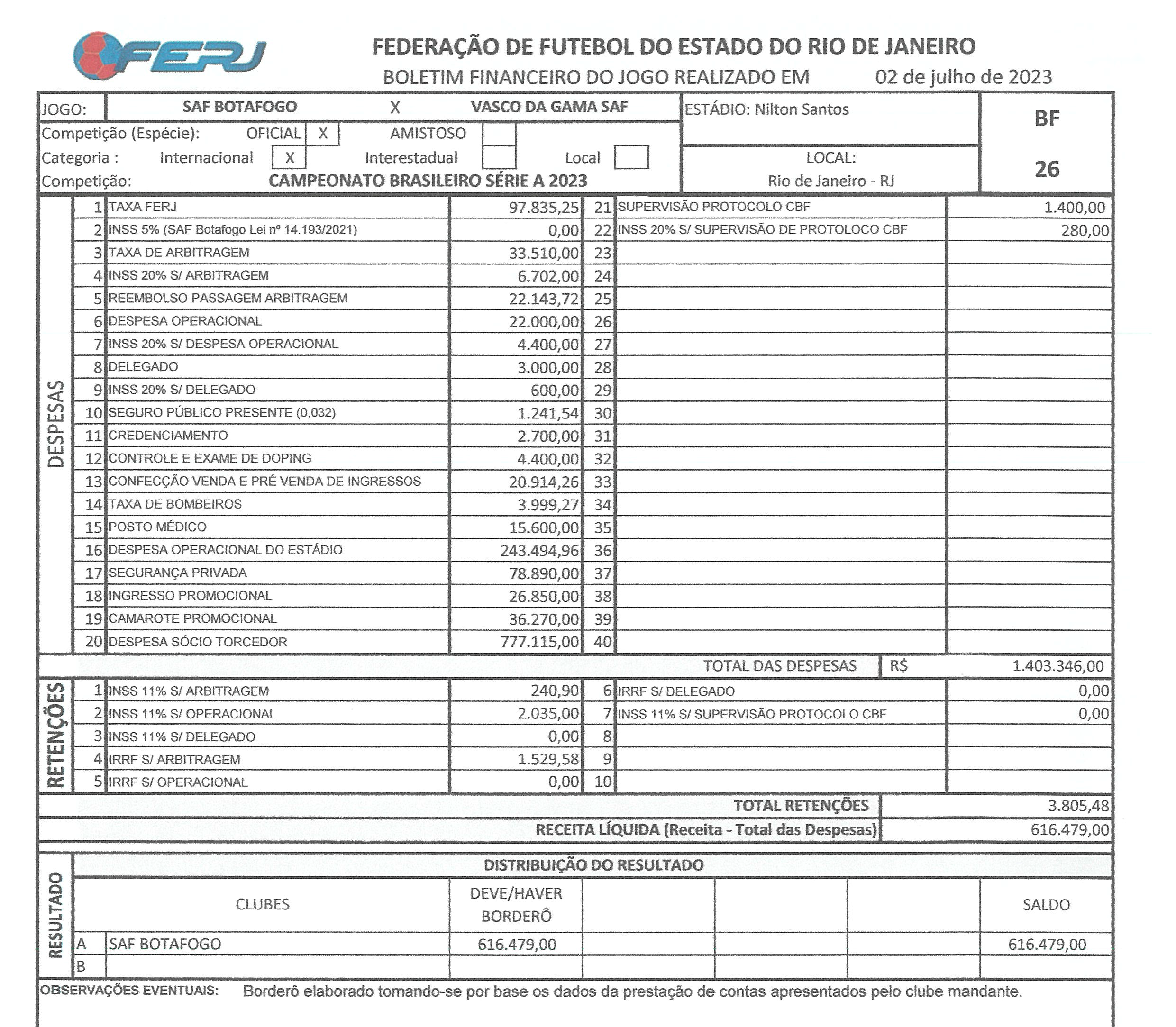 📋 Borderô de Botafogo 2 x 0 Vasco: