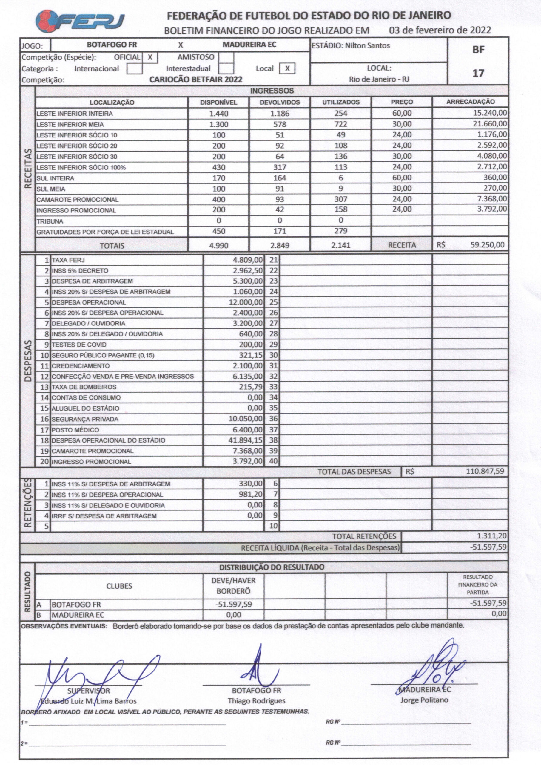 Confira o borderô de Botafogo 4×2 Madureira: