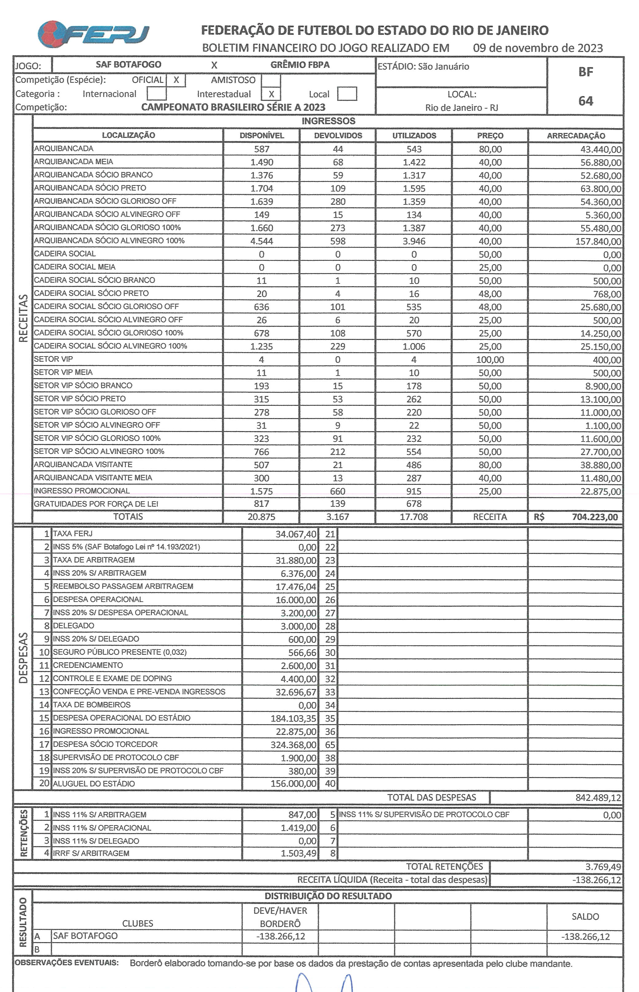 Nas despesas, além dos gastos com segurança, arbitragem, impostos e o aluguel em si, há também, por exigência da CBF, a diferença no valor dos ingressos comprados pelo sócios (com desconto ou check-in), que no caso foi de R$ 324 mil.