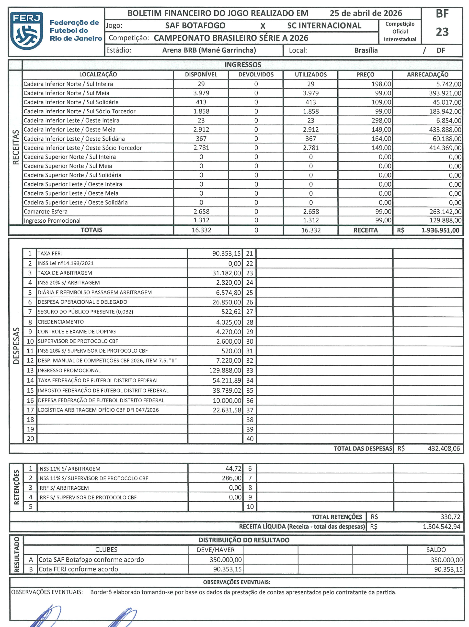 O Botafogo ficou com apenas 23% do lucro com bilheteria no empate em 2 a 2 com o Internacional no úlitmo sábado, no Estádio Mané Garrincha, em Brasília, segundo os números que constam no borderô oficial.
