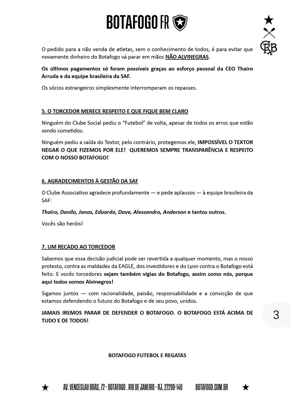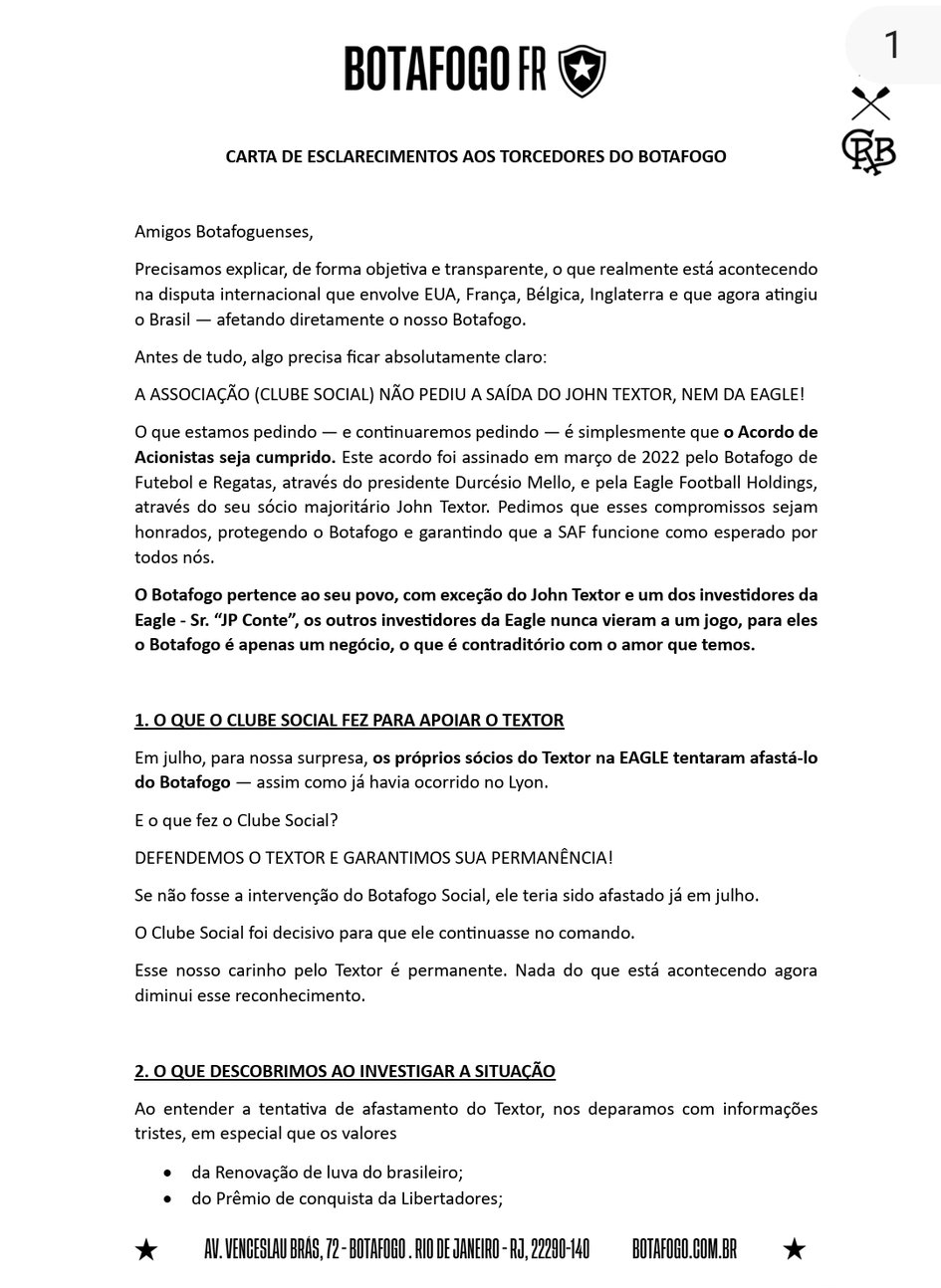 “Não só nós do Social, como todos vocês da arquibancada, tem [sic] a obrigação de proteger o Botafogo dessa sacanagem que fazem conosco e, por favor, SAF e Textor não neguem, pois todos sabemos a VERDADE! A Eagle levou e se nega a devolver, o discurso do caixa único se acaba com a quebra da devolução e isso não foi provocado pelo Clube Social“, diz o texto (leia a íntegra abaixo).