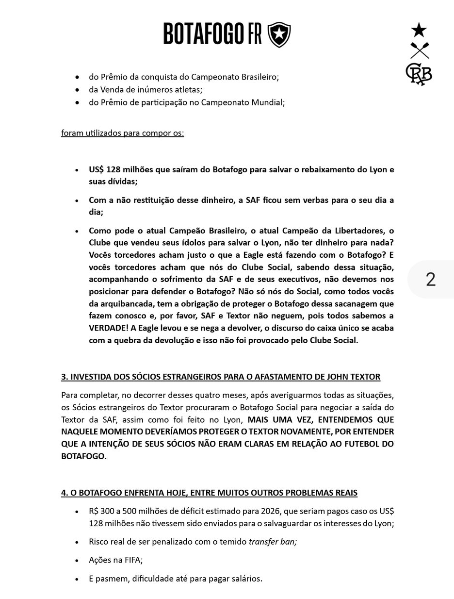 A carta cita “carinho permanente” a John Textor, lembra movimentos de proteção ao norte-americano, mas ressalta a preocupação quanto ao futuro, citando riscos de transfer ban, ações na Fifa e até de atrasos salariais.