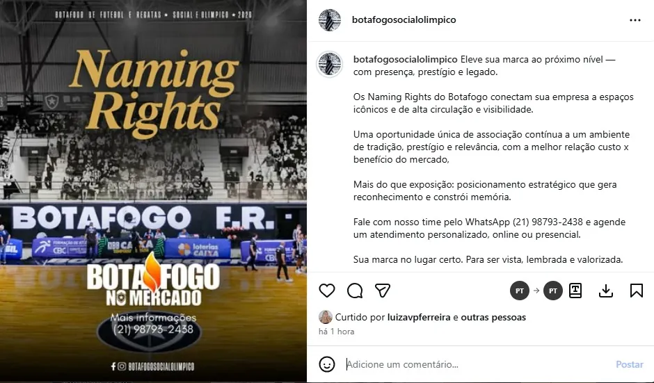 No texto, o Botafogo social oferece a empresas pelos naming rights a “elevação da marca ao próximo nível, com presença, prestígio e legado” e diz que “Mais do que exposição: posicionamento estratégico que gera reconhecimento e constrói memória”. Há o contato de WhatsApp (21) 98793-2438 para possíveis interessados.